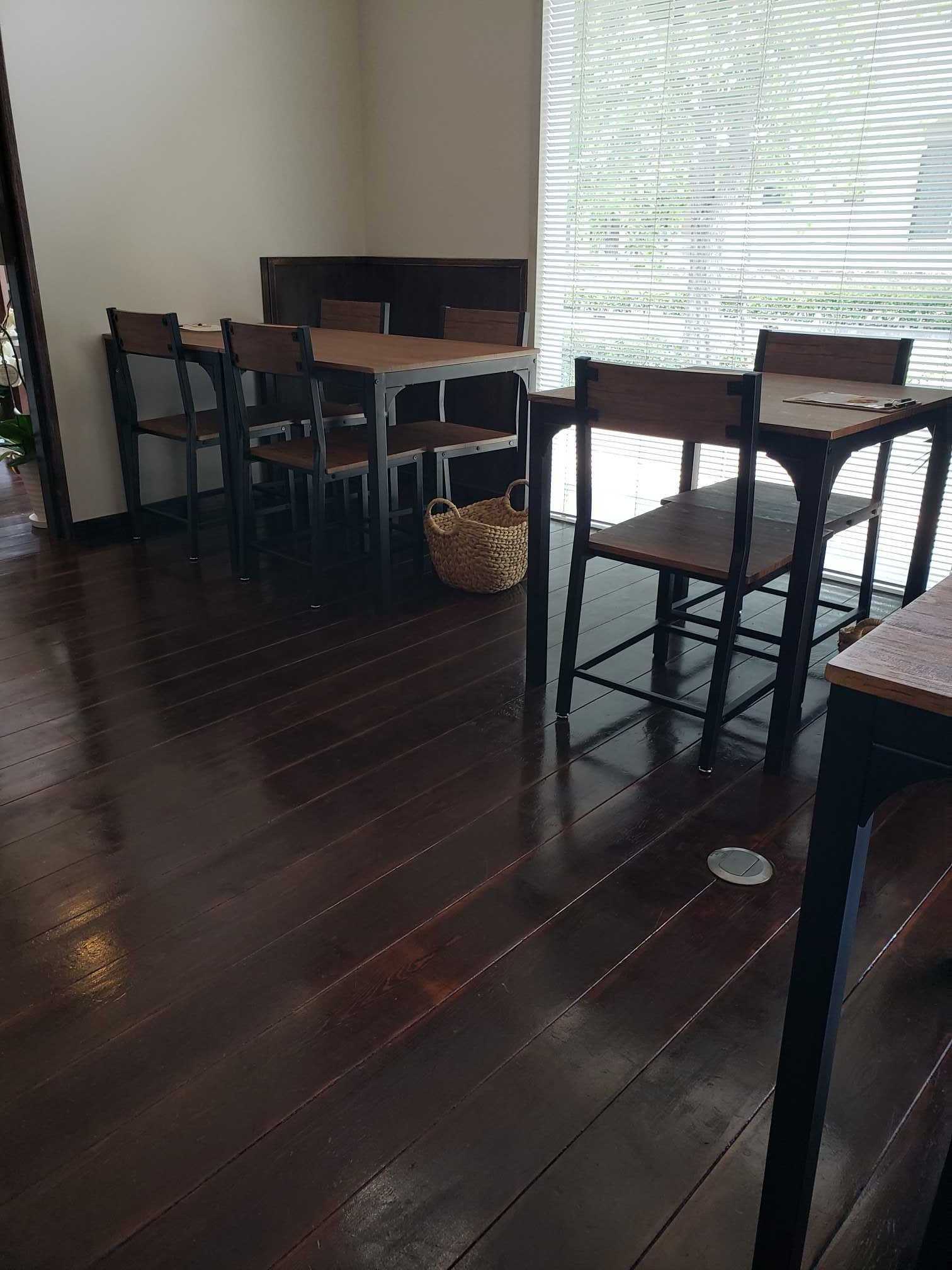 左に曲がるとホールがあり、窓際にテーブル席が並ぶ。