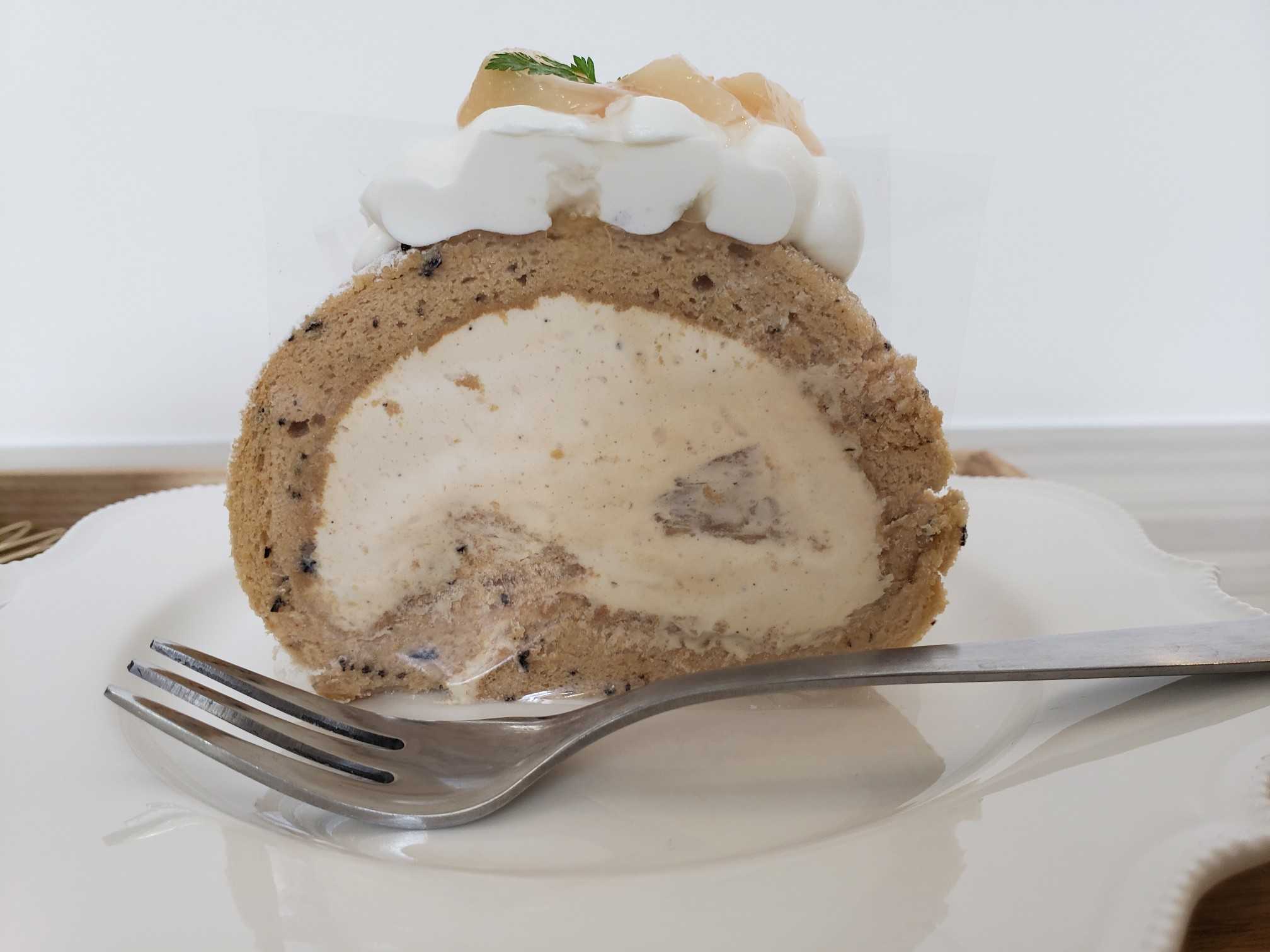 桃とアールグレイのロールケーキ。生地のアールグレイの香りよし!クリームたっぷりがよし!桃の甘酸っぱさが全体の味をまとめる、よし!そして、うんまい!!