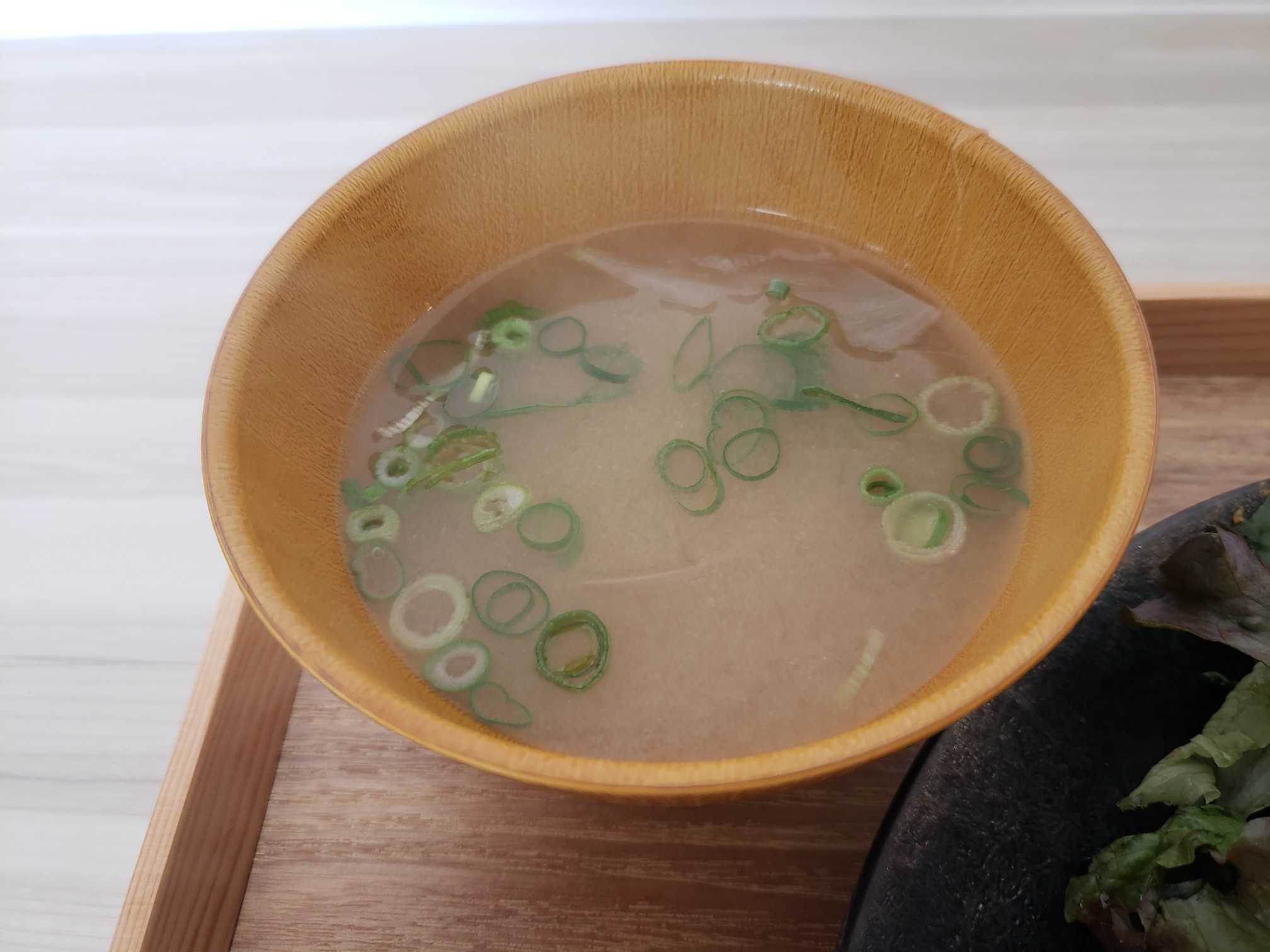 汁物は味噌汁、コンソメスープ、冷製スープが選択出来る。味噌汁をチョイス。玉ねぎがたっぷり入って風味がいい、うんまい!
