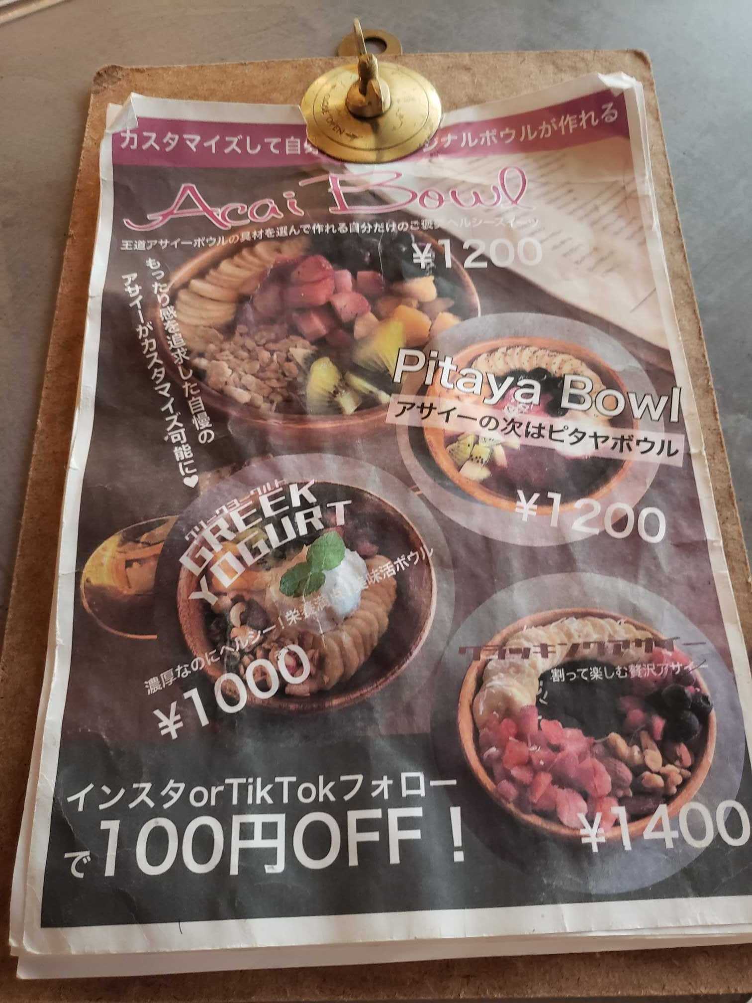 カウンター席に座ってメニュー物色。昼飲みもOkだが、どちらかと言うと昼はカフェ色が強い。流行のアサイーボウルもあります。
