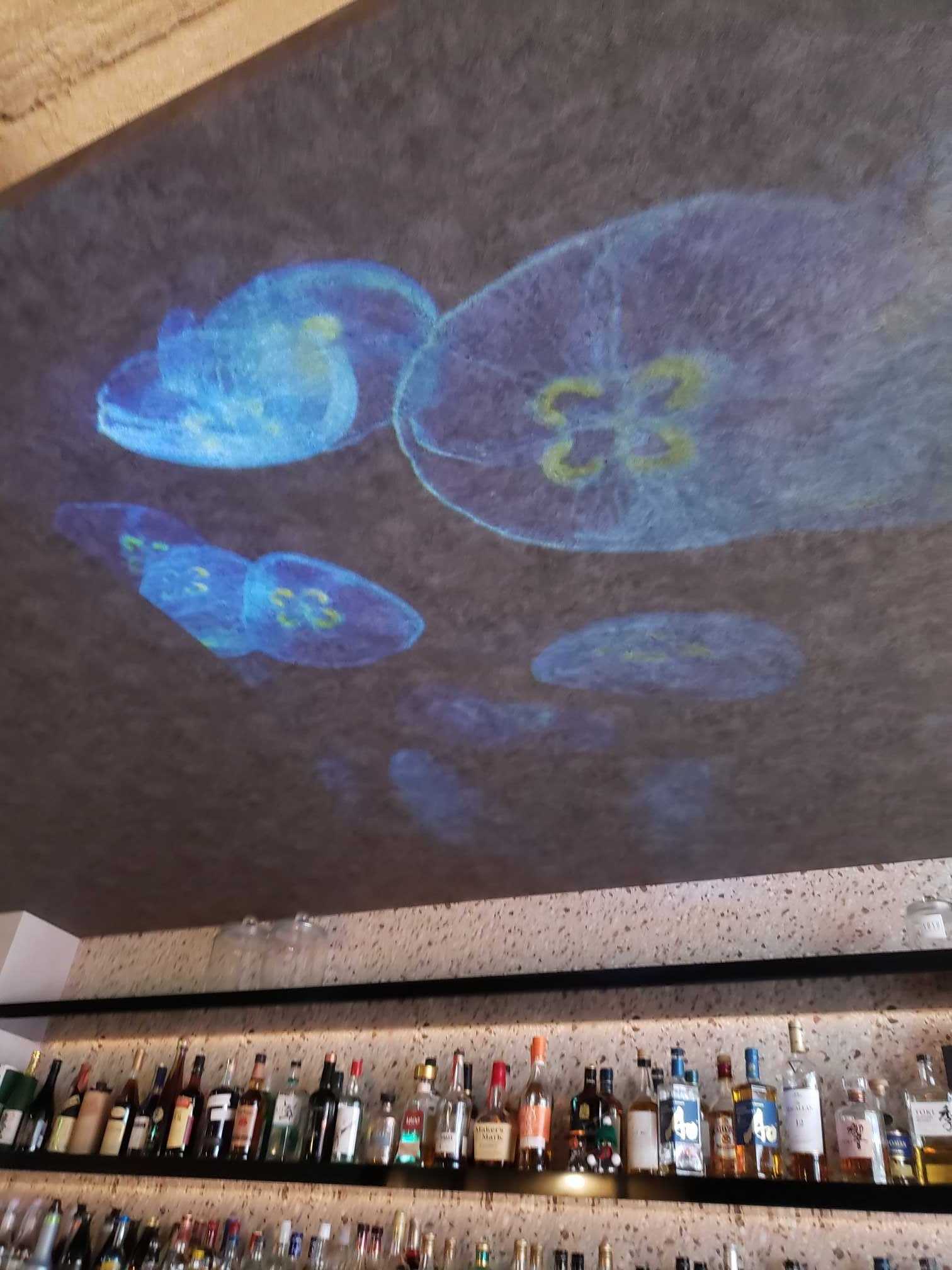 天井にはくらげのプロジェクションマッピング。凝ってますな。
