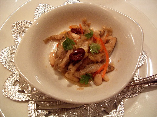 久しぶりのプリマです!やっと行くことができました。つきだし 青森産ワカサギのカルピオーネ、白ワイン仕立て 前菜.1 北海道産エゾ鹿肉とフォワグラ、トリュフ、ポルチーニ、ジロール茸のショーソン 前菜.2 ハンガリー産鵞鳥のフォワグラのソテー、青首鴨とフォワグラのスフォルマート 9種のヨーロッパ産キノコのフリカッセ、フランス・ペリゴール産ウィンタートリュフ添え 手打ちパスタ オレキエッテ 青森産アンコウと季節のイタリア野菜のラグーソース仕立て 魚料理 フランス・ブルターニュ産黒鯛のソテー、赤ワインソース、葉たまねぎのア・ラ・クレーム添え 口直し 高知産柚子のグラニータ、そのコンフィティール添え 肉料理 ニュージーランド産最高級仔羊(オーガニック系/ロムニー種)の背肉のロースト、 そのジュのソース、季節の焼き野菜添え ドルチェ フランス産最高級チョコレート(ヴァローナ『グランクリュ/ピュア・カライブ』)のフォンダン、 宮崎産金柑のソルベット添え 当然と言えば当然ですが、どれも素晴らしい。個人的に好みは前菜2つと手打ちパスタアンキモも入って、これはまさに…パスタ界の鮟鱇鍋やぁドルチェの最高級チョコレートも、金柑と一緒に食べて最高でした注文した白+持ち込んだワイン ・カラッチ ファレルノ デル・マッシコ[2003]ヴィラ・マチルデ カンパーニャ州・DOC。フランス・アリエ産小樽にて5ヶ月熟成。 品種:ファランギーナ 色は黄色から少し赤っぽく、鈍い色。イースト香。時間がたつと熟した果実香が出てきます。 味わいはシャープな酸というよりも、すっぱ系の酸で食事と相性が良い。特に今回はアンコウ、最高! ミネラルもあり、すっきりとした味わい。酸っぱ系苦手な方には向かないが、ボクは好み。・アウレオ[1999]ラ・カステリーナ トスカーナ州。フランス産小樽にて熟成。 品種:サンジョベ60%、カベルネ20%、メルロー20% 色はサンジョヴェのルビー色。落ち着いているせいか、香りはサンジョヴェよりメルローに近く、 味わいもまた同じ。酸が特徴的だったが忘れた(笑)後半にスパイスがくる。飲み頃。 Tシェフがすごくいいと言ってた。もっと買っておけばよかった(TT)・ブルネッロ・ディ・モンタルチーノ[1994]ヴァスコ・サセッティ←1986 説明省略 香りはたくあんの糠で初めは水っぽい。時間が経つと梅のように変化。 味わいは非常に複雑。ポルチーニを使った料理に合います。う~ん美味いろいろな楽しい話で盛り上がり、時間を忘れて終電ぎりぎり走って間に合いました!できましたら、また春ごろに伺いたいです近所のTさん、是非またご一緒しましょう!!