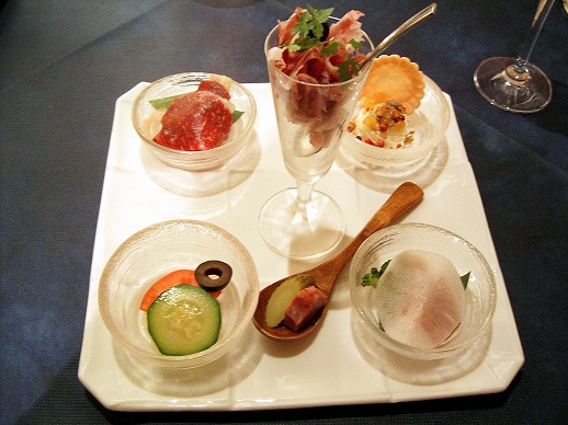 やっと書けた・・・久々、ホテルのダイニングで食事です・冷製オードブル盛り合わせ 桜肉とこうねを胡桃味噌で、干しあんずとナッツのカナッペetc ・温製オードブル盛り合わせ 国産りんごのコンポートあぶり鴨を添えて、信州サーモンの味噌焼きetc ・本日のスープ なんだっけ? ・メイン料理 牛ロースのグリエ 3種類のソースで ・ナゼかご飯物 五穀米のそば味噌 ばん茶づけ サフランライスの焼きリゾット カレーソース添え ・デザート パンナコッタ風 何かダレかの誕生日でもらったケーキ 料理は冷製オードブルが酒飲みにはよかったですそれとシェフが僕らにだけナゼか、イベリコ生ハムをサービスしてくださいましたワインは(グラスも)持ち込みの・・・ペティ アルヴィン 2006 レ・クレーテ ブルゴーニュ・オート・コート・ド・ニュイ・ルージュ[2006]ユドロ・バイエ うまーーー 超幸せで部屋に帰って、予め買ってきたチーズと合わせたのは・・・ルビーノ[2003]ブリケッラ満足な夕食のトキでした