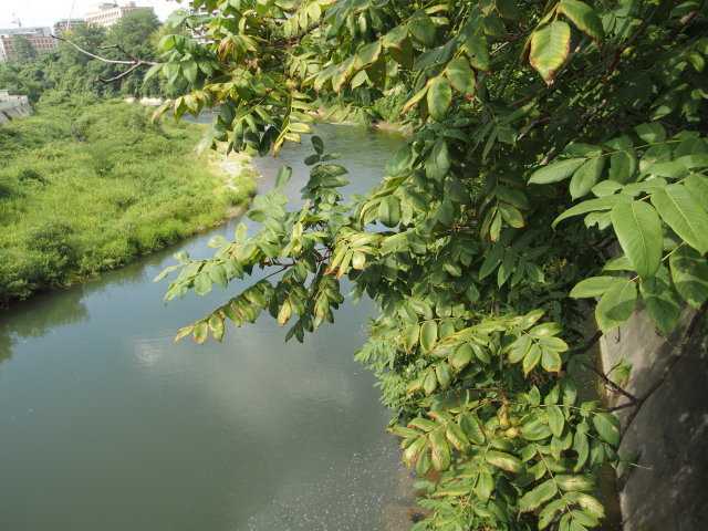 橋のたもとから木を見ると、しっかりと鈴なりのクルミの実。