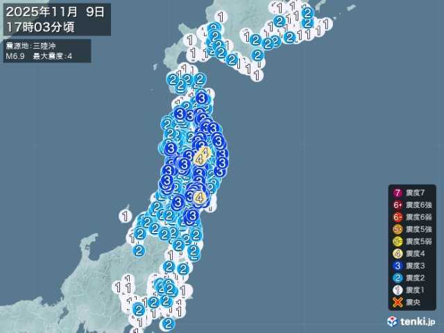 11月10日(月)昨日の夕方、三陸沖を震源とする地震がありました。当初はマグニチュード6.5といっていましたが、夜のニュース、そして今朝のニュースではマグニチュード6.9と報じられていました。あとで訂正されたようです。各地の震度の数値はかわっていませんでした。tenki.jpよりtenki.jpの地震情報のページも、数値が修正されていました。その後も小さな予震が何度も観測されていたようです。2011地震の震源エリアと重なるそうで、関連した活動の可能性ありとのこと。あれからもう少しで15年経ちます。緊張が一気に開放され、またたまってきているのか?