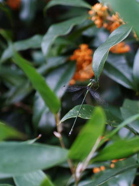10月9日(木)このところ、猛暑もすっかり落ち着いて朝晩はちょっと肌寒いくらいになってきました。今日は私の誕生日です。若い頃は喜んでいましたが、もうそろそろ誕生日を迎えることを喜べない年頃になってきました。・・・というか、喜ばなくなって久しいです。ランチのあと、戻る途中に立ち寄った良覺院丁公園。キンモクセイの花をチェックして、花が開いていたら写真でも撮っとくか、くらいの気持ちで公園の中へ。キンモクセイの木の前に来て近寄ると、手前からふわっと飛び立ってふわりと葉の先に。それは、by OLYMPUS STYLUS XZ-2金属光沢のある緑色のボディーの・・・オオアオイトトンボのオスのようです。2年前の夏、2023年8月1日にもここ良覺院丁公園のシモツケ植え込みのあいだで見かけています。写真楽天ブログ記事「朝出勤前の良覺院丁公園にて」このとき見たのはメスだったので、これでオスメスコンプリートです・・・オオアオイトトンボについてちょっと調べてみました。観察できる時期は5月から12月・・・とありますが、分布は北海道、本州、四国、九州と、ほぼ全国すみからすみまで。ということは、地域によって少し時期が違ったりするかもしれません。「オオ」とつくからにはつかない「アオイトトンボ」もいるわけで、元祖アオイトトンボより大きいからオオアオイトトンボということです。でも、大きさでは数ミリほどの違いを見分けるのはかなり困難、となりどうしで並んでいたりしない限りムリでしょう。ボディーのデザインが若干異なるので、いろんな角度から写真を撮って、あとでじっくり観察する必要がありそうです。「水面におおいかぶさった木の樹皮に産卵する習性があるので、木陰のある池でよく発生するそうです。この近くで木陰のある池、といえばすぐ横の緑水庵庭園しか考えられません。その池がなくなってしまったら、オオアオイトトンボの姿も消えてしまうのでしょうか。震災以降、池を満たす水の供給源だった地下水の水位が下がり、ほとんど雨水頼みの状態なので、長く雨が降らないとかなり水量が少なくなってしまいます。オオアオイトトンボは毎年この良覺院丁公園でよくみられますが、それは当たり前ではないのですね。