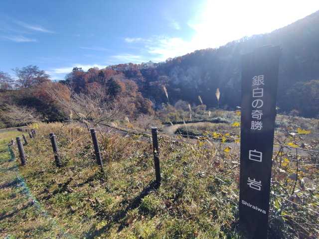11月16日(日)そろそろ秋保エリアも紅葉が見頃になってきているはず。2度ほど下見していた「白岩」へ行ってみよう!と意気込んだは良いものの、家を出るのが遅くなってしまい、現場に到着したのは12時頃でした。by SHARP AQUOS Sense9日が回ってしまって、肝心の白岩の壁はすっかり日陰になってしまっていて残念。しかしその左側、そして右側の山は手前側に出っ張っていて、日が当たっていたので色づいた木々がきれいに見えました。それだけでもまあ良しとしよう。せっかくここまで来たので、さらに足を伸ばして二口街道を奥へ行き、「仙台市秋保ビジターセンター」へ。展示されていたツキノワグマの剥製を見て、クマの恐ろしさをあらためて実感。案内を見てみたら、磐司岩の手前、「磐司駐車場」までは車で通行可ということだったので、行けるところまで行ってみることに。駐車場周辺から磐司岩を眺めます。真昼なので熊に遭遇する危険はほとんどないですが、早々に引き返してきました。