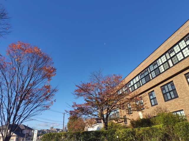11月11日(火)昨日は雨が降ったりしましたが、今朝はほぼ快晴。冬型気圧配置時の典型的な東北太平洋側の天気です。よく晴れていますが、冷たい西からの風が強く吹き付けています。朝、バスを降りて職場まで歩いて行くT途中の南六軒丁通り。見上げれば深い青色の秋の空。そして、東北大学片平キャンパス南の端にある「21世紀情報通信研究開発センター」の建物。by SHARP AQUOS Sense9写真を撮ったときには気づかなかったのですが、空の真ん中に白い点が写っています。なんと!・・・月でした。今どきのスマホカメラはすごいですね。エントリーコンデジが消えていった社会情勢?も、こういうのを見るとなっとくさせられます。話は戻って、「21世紀情報通信研究開発センター」とは、なんだか時代の先端を行く研究開発が行われている雰囲気の名前ですが、じつはこの建物、この場所が「仙台高等工業学校」だった時代のもので、昭和5年(1930年)に建てられた歴史的建造物なのです。一口に仙台高等工業学校と言っても、「旧」仙台高等工業学校と「新?」仙台高等工業学校の時期に分かれていて、そのあいだには東北帝国大学附属工学専門部時代があったとのこと。(Wikipediaの受け売り)最初の仙台高等工業学校は、古く明治39年(1906年)に設立された旧制専門学校で、このときの略称が「仙台高工」または「SKK」だったそうです。1912年に東北帝国大学に包摂されて、東北帝国大学附属工学専門部となりました。のちに東北帝国大学に工学部が総説されるとき、廃止になってしまうところを県や市などによる存続運動によって存続が決まり、1921年に再び仙台高等工業学校として東北帝大から独立したのだとか。第二次大戦中の1944年(昭和19年)に「仙台工業専門学校」(略称は仙台工専)と改称されたそうですが、その前の戦前にこの建物が建てられたというわけですね。戦後、1947年に単科大学への昇格運動が起きたものの実らず、1948年に文部省により「一県一大学」の原則に基づいて東北大学工学部に合併され、翌1949年に新制東北大学が発足した際には「工専合併」に伴って旧制の東北帝国大学工学部にはなかった土木工学科、建築学科が(工専から移るかたちで?)新設された・・・建物の真ん中には、こちら側から向こう側に抜けられるようにくりぬかれていて、その上に「SKK」と浮き彫りされたプレートが掲げられています。現在はこの建物のキワのところまで、東北大学から東北学院大学に売却されたので、いま立っている場所は東北学院大学キャンパス内ということになります。2012年5月28日に、まだ南六軒丁通りまでが東北大学キャンパスだったときに少し観察していて、日記にも書いていました。Google Bloggerの「仙台市青葉区片平界隈情報」ブログにも記事を投稿しています。記事の最後に「この「SKK」のような古くて趣のある建物は、大学の事情で消えてしまうかもしれません。今のうちに、写真に残しておきたいです。」と書き残していました。建物はなんとか残りましたが、その南側の土地は削られて、売られてしまいましたね。片平キャンパスの南端エリアが東北学院大に売却されたすぐあとに見たときの写真と日記は、2016年8月19日付の投稿に記されています。このときはまだ敷地境界の植え込み垣根もまだ育っていなくて、出入りできるような門扉も機能しそうな雰囲気だったようです。