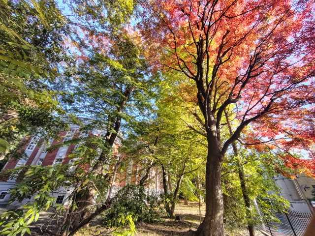 11月4日(火)爽やかに晴れた今日の仙台。気温は高くないけれども、日なたではぽかぽかと暖かいです。片平丁通りを歩いていても、まだまだではありますが木々の葉が赤や黄色に色づき初めて来ました。旧東北帝国大学理学部生物学教室(放送大学宮城学習センター)の建物は、大正時代のもので保存有形文化財に指定されていますが、その建物の周囲の庭?(かつては駐車場になっていましたが)のモミジの木が葉を赤くしていました。ちょうど、片平丁通りのほうから日が当たるので、敷地の中から見ると光を透かして見るかたちになるので、ただ「赤く色づいた」というよりいっそう美しいです。by SHARP AQUOS Sense9葉が落ちきるまでのあいだ、日が差す晴天の午後はこのような秋の景色を楽しむことができますね。スマホで撮影した写真ですが、非常にきれいに撮れました。裏へ回って、日陰の小径へ。ここではいわゆるミコシグサ(神輿草、ゲンノショウコの実がタネを飛ばしたあとの抜け殻?)が足もとに。by OLYMPUS STYLUS XZ-2もっとたくさんあちこちに映えていたはずのゲンノショウコですが、何度か入った除草作業でどんどん減って、無事にタネを飛ばし切るまで生き残ったものは少ないです。でも、まわりの草が取り払われたおかげで、地面すれすれまで視点を下げても、神輿草が映える景色を見ることができたという点では、除草作業にも感謝しなければならないかもしれません。ほんの10~20メートルほどの短い小径を抜けて、旧東北帝国大学理学部生物学教室標本園のほうへ行ってみます。ここにはキチジョウソウがビッシリ生えて(植えて?)あります。まわりの木々から落ちる枯れ葉が降り積もっていますが、花序の下から順に開いてきて、ようやくてっぺんの花も開いたところのいちばん見頃の良いタイミング。カメラを地面に置いてちょっと見上げるようなアングルで撮ってます。今度は上からてっぺんの花を見下ろしてみました。ほんわかソフトなムード。毎年この時期、この場所で吉祥草の花をじっくり眺めるひとときは、こころ和みます。