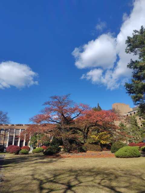 11月18日(火)未明に雨が降り、朝には回復していたものの地面はまだ濡れているというような一日の始まり。昨日はずいぶん暖かかったのですが、今日は朝から寒くて、日中もほとんど気温が上がらず最高気温の予想は9℃。機能が22℃だったので落差が激しいです。出勤前にちょっと片平丁通りをブラブラと歩いてみました。by SHARP AQUOS Sense9東北大学正門の南側に立つ大イチョウは仙台市の保存樹木に指定されている立派な木ですが、キャンパスの外、さらに道路を挟んだ向かい側から眺めて写真を撮るのはかなりレアです。昨日の冬型気圧配置のせいで風が吹き、かなり葉が落ちたと思いますがまだ残ってます。信号を渡って片平公園に降りて行き、広瀬川を見下ろしてみました。対岸ではクマ対策のための大規模な除草作業が進められています。そのようすが見られればと思ったのですが、こちら側で木や草が生い茂っているためによく見えません。片平公園には桜の木やサザンカの木が植えられていますが、伊達政宗由来の「臥龍梅(がりょうばい)」もあります。そして最近看板が立てられたのは「野球の試合前挨拶発祥の地」。もともとこの公園は旧制二高のグラウンドだったところで、ここで野球の試合が行われた際、日本ではじめて「試合前の挨拶」が行われたということです。へー片平丁通りを北へ上がっていくと、道端にツワブキの黄色い花と、サザンカ?のピンク色の花が。なぜサザンカ「?」なのか。花のおしべのようすや葉のかたちなどを見るとサザンカっぽいんおですが、花びらが薄っぺらいのと咲く時期がサザンカにしては早いのではないかという疑惑があるためです。おそらく、さくらホールの前で先日(11月8日)見たものと同じ種類だとは思うのですが、まだこれらがサザンカだという確証が得られていません。さらに片平丁通りを進み、放送大学宮城学習センター(旧東北帝国大学理学部生物学教室)のほうに目を向けると、通りに面して並ぶ木々の葉もかなり落ちてしまっていました。片平丁小学校の向かい側からは西に向かって視界が開けており、崖の下の広瀬川、評定河原橋、そしてはるか奥には八木山の東北放送、右手奥に仙台城本丸、左手には瑞鳳殿のある経ヶ峯の森を望むことができます。先ほど片平公園からは見えなかった除草作業現場が、ここからは見えます。月末まで続く予定だそうです。クマの通り道にならないように、きれいに草刈りされるというわけです。ここで折り返して、片平丁通りを逆に下って行きます。放送大学宮城学習センターの裏口からキャンパス内へ入り、旧東北帝国大学理学部生物学教室標本園のほうへ向かい、グルッと回って、ムラサキシキブの木のところへ。葉がまばらになったので、紫色の実がよく見えるようになりました。さらに回っていくと・・・え?なんと、枝が一本、付け根から裂けてしまっています。先には枝分かれしたたくさんの細い枝、そしてたくさんの実がついています。よほど風が強かったのでしょうか。今後が心配です。