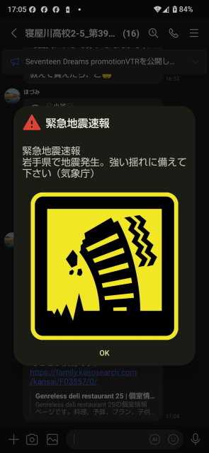 11月9日(日)17時ちょっと過ぎ。ゆらゆらと周囲が揺れ出しました。お?地震か・・・程度に考えていたら、あの音がスマホから流れてきました。そして「緊急地震速報」の表示、そして「地震が来ます!」という音声。ネットで確認してみると、tenki.jpの地震情報ページより17時03分に発生したマグニチュード6.5の地震、震源は三陸沖。仙台市青葉区の震度は2でした。ガタガタというよりはゆらゆらという感じの揺れでした。約1時間後の17時54分にも同じくらいの地震がありました。震源もほぼ同じで仙台市青葉区の震度も同じく2です。マグニチュードは6.3。NHKで「カネオくん」放送時間に地震関連のニュースが報じられ、結局「カネオくん」は見ることができませんでした。しかし、震源の場所が2011のときとかなり近いように見えるのが不気味です。