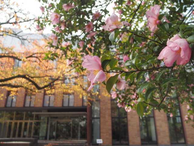 11月8日(土)東北大学片平キャンパスの真ん中あたりにある「さくらホール」。その前には細長いロータリーがあり、ハギやキンモクセイが植えられています。その南端に立つ木に、ピンク色の花がたくさん咲いているのに気づきました。by OLYMPUS STYLUS XZ-2さくらホールの玄関脇に立つ桜の木は葉が色づいて、ハラハラとそんな色づいた葉を落としています。さてこのピンク色の花はいったい何だろう?Googleの画像検索にかけてみたら・・・え?「サザンカ」だって?うーん・・・私がイメージするサザンカの花よりも花びらが「だらしない」ような印象だったので、なにか今まで見たことのないはじめて見る花だと思ったのですが・・・しべのようすなどをよく見てみれば、たしかにサザンカのようです。この場所は季節を問わず数え切れないほど通りかかっているはずなのに、意識的にじっくり観察したのはもしかしたら今日が初めてだったかもしれません。それにしても、サザンカだとして、花の咲く時期がやけに早いように思われます。馬上蛎崎神社のサザンカは、最近ようやく小さなつぼみがポツポツと出始めたばかりという状況なのに。・・・これ、ほんとうにサザンカ?