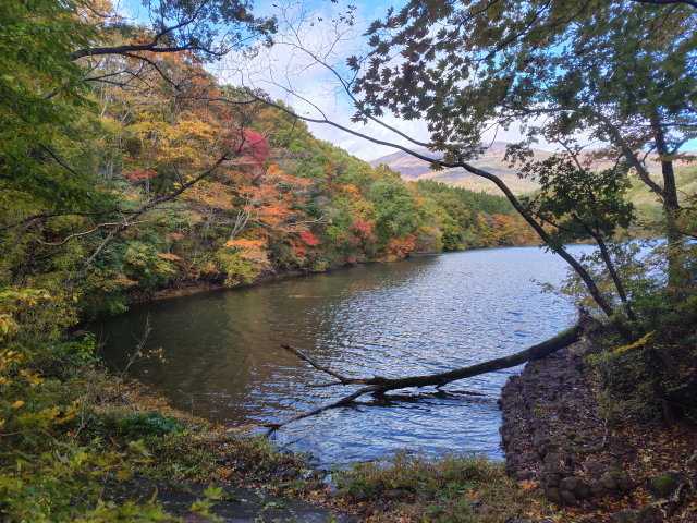 11月1日(土)三連休初日の今日、天気もまずまずだったので、どこかへ車で出かけようということになりました。この季節、やはり紅葉を見に行くのがいちばん。・・・ということで、七ヶ宿(宮城県)方面へ向かうことに。先月、「長老湖」という紅葉の名所があることを知り、チャンスがあれば行ってみたいと思っていましたので、tenki.jpの紅葉情報で「見頃」ということを確認し、いざ出発。山道を走るあいだにも、ところどころ色づいた景色が見えて、ムードは盛り上がります。長老湖は「南蔵王の名峰・不忘山(ふぼうざん)」(※知らなかった。今回初めて知った山)のふもと、山の南側にある南北に長いかたちをした湖です。周囲およそ2キロメートルと、それほど大きくはないサイズで、グルッと一周回ることのできる遊歩道もあります。「みやぎ蔵王三十六景」・・・大河原地方振興事務所が仙南の2市7町、各商工会と連携して選定した、各地の「蔵王」を背景にした素晴らしい景観36か所、ということらしいです。当然ながら長老湖もその中に入っています。剣道51号線(南蔵王七ヶ宿線)から入って行き、湖の南側にある駐車場に車を置いてすぐ、長老湖の南端に出ます。手漕ぎボートも営業中でしたが、寒いので利用はせず。売店、食堂もありました。西のほうへ入って行く道があり、それを900メートルほど歩いて行った先には湖の西を南北に流れる横川にかかる「やまびこ吊橋」があります。最近話題になっている熊遭遇、襲撃のニュースにビビって、山道を歩くのは遠慮することに。湖を巡る遊歩道歩きもナシ。ほんの少し湖を眺めるに留めたかたちではありましたが、湖の西側、by SHARP AQUOS Sense9そしてはるか北に見える不忘山のふもと(山頂付近は雲に隠れていますが)の紅葉は、なかなかきれいでした。湖の東側は、太陽の位置の関係で日陰になっていたからか、それほど色鮮やかという印象はありませんでしたが、人も少なくてゆっくりと秋の景色を楽しみました。帰り際に、バスでやってきた団体さんがどやどやと入ってきたので少々にぎやかになりました。これをしおに退散することに。風も強くて長い時間滞在するのがツラかった、ということもありますが。山を降りて「道の駅七ヶ宿」へ。おこわのおにぎりを購入、建物の前で山形からやってきていたトラックで豚汁購入。強風に難儀しながら外のベンチで昼食。七ヶ宿ダムの下流側にある「七ヶ宿ダム展望公園」にも立ち寄り、そこでちょうど13時になったので噴水が出始める場面を見ることができました。ただし、強風のために水は上に吹き上がらず、横に流されてしまっていました。この公園はダム(白石川)の左岸にあたる場所ですが、対岸の右岸には、道の駅から端を渡ってこのダムまで通じる右岸道路があり、ここからの景色も「みやぎ蔵王三十六景」のひとつに挙げられている、ということを後で知りました。また行く機会があったら右岸のほうにも回ってみたいろと思います。