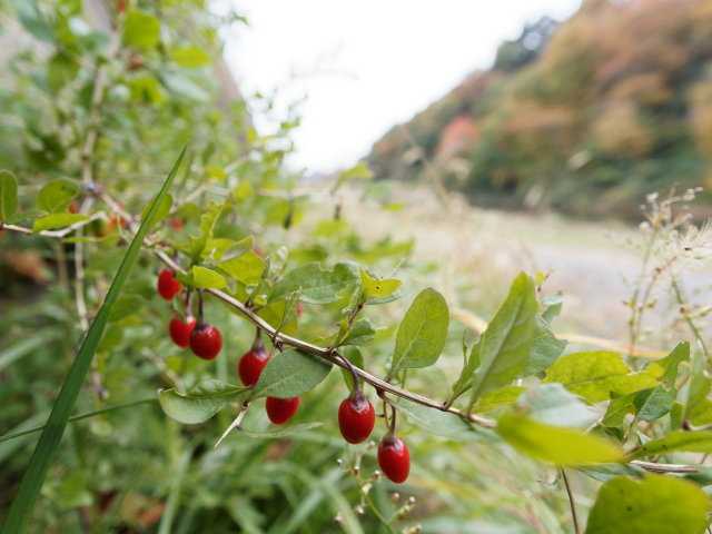 11月13日(木)朝、出勤前の道草・・・米ヶ袋の広瀬川遊歩道散歩です。クコの花が咲いていた場所へ行き、実ができているかを確かめたかったのと、宮城県工裏の辺りにみっしり咲いていたヒヨドリバナがどうなっているかが気になっていたのが理由です。いつものように縛り地蔵の脇から入ってクコの現場へ。すっかり花はなくなって、たくさん実ができていました。by OLYMPUS OM-D E-M1 Mark III + Panasonic LEICA SUMMILUX DG 9mm F1.7 ASPH.写真を撮っていたら、横からシャリンシャリンという鈴の音とともに「ポニーのポーちゃん」がやってきました。ポーちゃんはこの界隈では超有名です。ポーちゃんを連れてきたお母さんに声をかけられました。「去年くらいから急に増えたのよねぇ」クコのことです。たしかに、私もここのクコに気づいたのは去年あたりからだったように記憶しています。そして、ポーちゃんの散歩拒否エピソードが河北新報の記事になってましたね、と話を振ると・・・そこから止まらなくなりました。ちょうど近くで工事をしていて、ガンガン大きな音が響いていたので、ポーちゃんはああいう音がきらいじゃないんですかと訊ねてみたら、意外と気にしていないとのことでした。むしろ、鳥が急に羽ばたいて飛び立つ音とか、ビニール袋がシャカシャカと風で飛ばされるときに出す音とかはきらいみたいなんだとか。へー