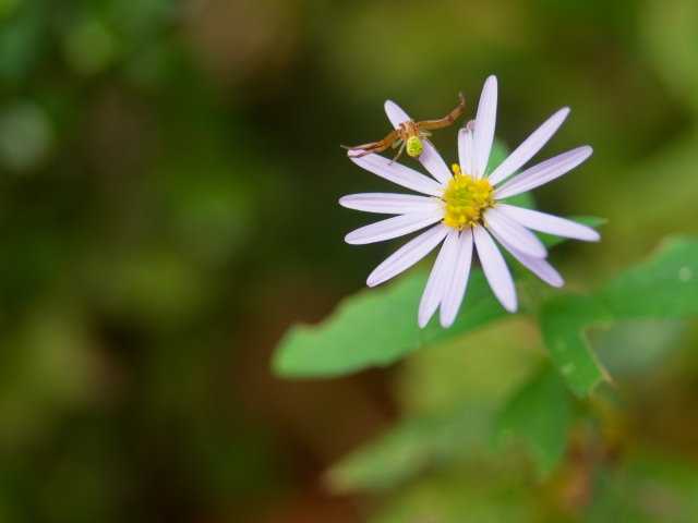 11月5日(水)今日も昼休みに東北大学片平キャンパス内を歩いて、なにかおもしろいものはないかと探してみました。今はノコンギク(野紺菊)とキチジョウソウ(吉祥草)が見頃です。とはいえ、ノコンギクのほうはこのフィールドでもすでに散々撮影しているので、花だけの写真はもういいか・・・などと思って素通りしようと思ったら、ふと花の上に誰かがいることに気づきました。ここでリュックに入れてきたOLYMPUS OM-D E-M1 Mark III ミラーレス一眼カメラとOLYMPUS M.ZUIKO DIGITAL ED 12-40mm F2.8 PRO ズームレンズのゴールデンコンビ登場。by OLYMPUS OM-D E-M1 Mark III + M.ZUIKO DIGITAL ED 12-40mm F2.8 PROハナグモのようです。長い前脚?を広げて「さあ、来なさい」と言っているようです。でもそんなにあからさまに待ち構えていては、だれも近寄ってこないのでは?前からも撮らせてもらおうと、ガサガサ回り込んだら・・・花の下に隠れてしまいました。やっぱりそうなるか。一生懸命、横から下から狙って撮影しましたが、残念ながらどれもピンぼけ。あきらめてキチジョウソウ畑に向かおうかと思ったら、別の花に別の虫がいるのを発見しました。細い翅が特徴の・・・なんだろう?写真は撮ってみたものの、あとで見てみたらこちらもピンぼけでした。残念。キチジョウソウのほうは、じっくりピント合わせできるので歩留まりは格段に良いです。花序の下のほうから順に花開き、まだてっぺんのほうはつぼみという株が多い状況。まだまだ楽しめそうです。しおれた後もなかなか見応えがあるので、楽しみです。