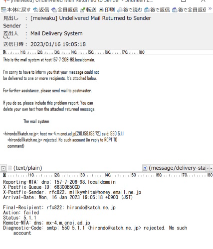 メールが相手に届かなかったってことか?こんな内容のメール初めてだと思うけどでも微妙におかしいんだけど・・・・・未着が差出人に返送されたってどっちがどっちでこっちはどっちだよってこっちが差し出しならそんな送信したこともないしこっちが届く側ならこんなメールが来るのはおかしいしてか自分のアドレスにもしもこんな感じのがサーバーから来るならメールタイトルのSubjectがこんなんじゃないしメールの中身に日本語の行がないとおかしいしで、IPアドレスが書かれてるけどそれ調べたらロシアだしまた、ロシアかこういうのは中国かロシアかと相場が決まってるって感じかな
