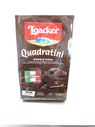 ロアカー クワドラティーニ ダブルチョコ商品名のブルってなにがだろうって思ったけどパッケージ見ると写真には外側もチョコがかかってるような・・・・・って見えたので期待したんだけど実際には、ほかのと変わらずチョココーティングされてはいなかった・・・・・けど、食べてみるとほかのチョコやダークチョコよりチョコが濃くて甘い感じがある見た目は違ったけど味的には期待に近い感じでなんかあっという間に食べちゃった★★★★☆って 3.5くらいにしたかったけど