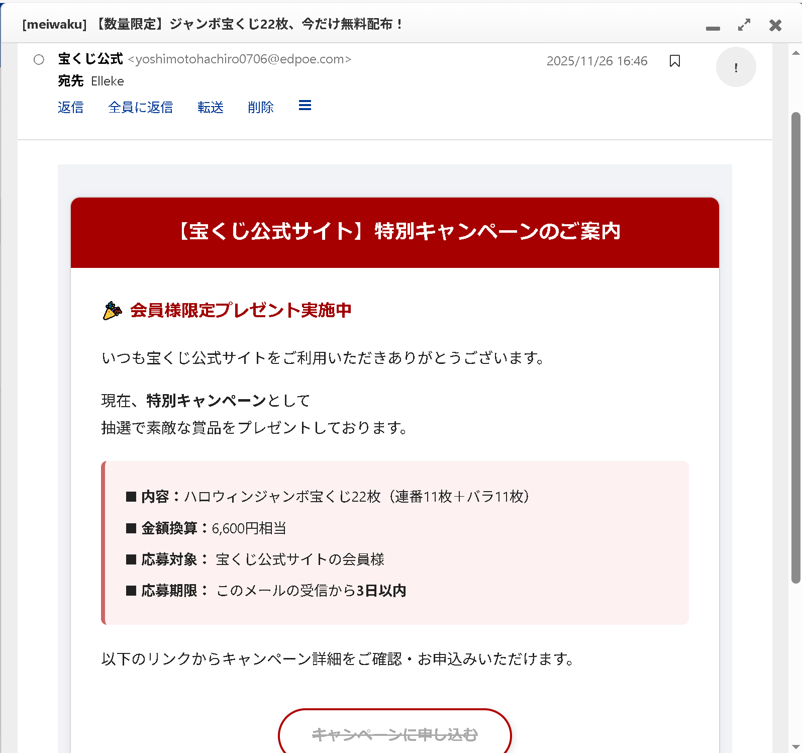宝くじ公式サイトから特別キャンペーンとしてハロウィンくじが22枚??一応、抽選でとは言っているがそもそも、このメールが11月26日に届いてるけどハロウィンくじは10月中に販売が終了して抽選も10月に終わってるのにこんなに後になってプレゼントなんてのもおかしいけど22枚のうち連番11枚、バラ11枚って連番を11枚というおかしな枚数って連番は普通10枚ごとの扱いだからどこかおかしい感じがするけどま、こういうフィッシングメールは相手の差出メアドが全然公式のアドレスじゃないし