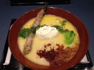 イベント会場のすぐ近くにお店があったので、ここぞとばかりに並んでみた。って行列店ですよ。イベント時に行列店はリスキーだけど、「白 鶏白湯そば」という何やら美味しそうなメニューがあるし、もうお願いするしかないでしょう。麺巧 潮ふつーに大盛りを頼んでしまった。んーそろそろ自粛してかないとねえ。←棒。なんだかかっこいい見た目の真ん中に白く鎮座するのは、ポーチドエッグ。アスパラの豚肉巻きという身体にも良さげなトッピングも、美味しいうえユニークではないですか。シチューのような……というレビューを目にして、「見た目は確かにそんな感じだけどね」と受け流していたのだけど、これがホントにびっくりシチュー味ですよ。そうか、鶏出汁をたっぷり濃厚にとったところにバターの風味がふわり加わると、シチューの味に近づくのか! シチューだけどラーメン、濃いのにさらりとした味わい。これは癖になる。スープの量が控えめなのも、大人には嬉しい。悩まず完食できますからね。悩んでも完食するんですけどね。次にここでまたイベントがあったら、リピ確定です。