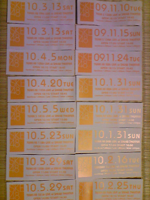 チケットを整理するついでに写真撮ってみた。右上にあるのが記念すべき私自身の1回目公演。S公演でした。ただキャン待ちで入ったから立ち見で、全然珠理奈が見えなくて泣きそうでした。だからそれから一週間経たないうちにもう一回S入りに行ったんです(笑)11月24日 K2初観戦!もうこの時点でK2ヲタになろうと決めちゃいました。もともとAKBから入ってるんで、K2 1stの楽曲内容は熟知してましたから、応援がしやすかったってのもあります。でも、それ以上の理由として、私が見に行ったときは、千秋楽の少し前で、もうチームとして方向性が定まってきている段階に達していました。だからこれからチームK2がどのように飛躍していくのか、非常に見ごたえがありました。といってもそのかなり前から認知はしてたんだけど、最初はメールの送り方を間違えてて当たらないことに気づかず、何だかんだで5ヶ月くらい経過しちゃいましたw1月31日 この日は初めて1日3回公演に行った日です。今じゃこんなことは滅多に考えられません!でもこの当時はまだあまり人気が無かったので、送れば85%は当たってた気がする。たしか3回目はちゅりが休演していて、安奈ブルドンだったのかなぁ?あんまりよく覚えてないけど、そっから安奈を推し始めました。2月16日 研究生公演初日→ハイタッチで高まりほ~!!まさか入れるなんて誰が思っただろうか。3月13日 K2の100回記念公演。未だかつてK2でこれほど高まったときは無かった。あの日の客のテンションはみんな異常だった。メンバー(特に茉夏)は始終泣きっぱなしで、ケチャとMixが縦横無尽に飛び交ってよい意味でとってもカオスでしたwで、今日行ってきたのが29日の1回目と2回目。2回目は推しメンの一人、石田安奈ちゃんの生誕祭だったわけですよ。こうして振り返ってみるとまだたったの16回しか行けてません。最近は行きたくてもなかなか当たらなくなってしまって…。それだけ人気が出てきてるってことですよね。