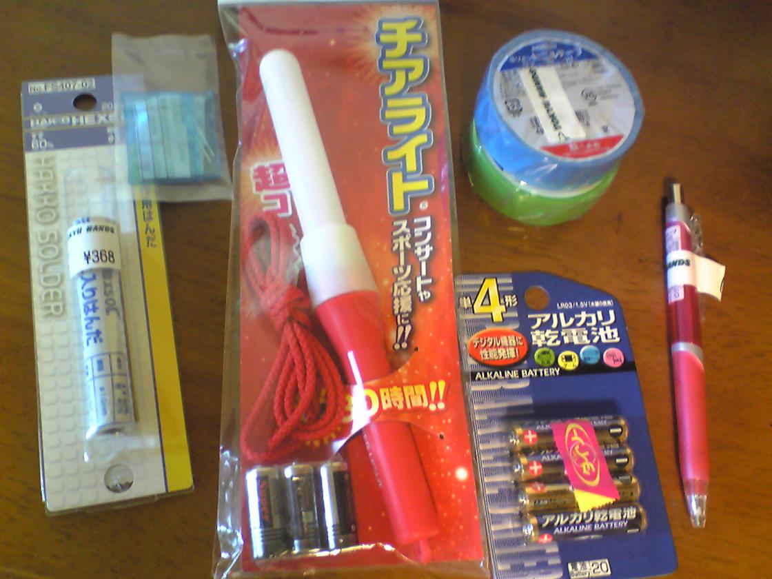 日曜日3人で6通応募したのですが、結局1通しか当たらず、私は日曜日は干されました;;気を取り直して19日応募しましたってなわけで、今週は土日予定が無くなったので、今後の公演に備えて色々買い物してきました!主に名駅高島屋のハンズですが、栄のダイソーと大須の第2アメ横にも行ってきましたd(^^*) 土日はエコキップあるんで便利ですよね~!買ったものは、写真の左側から順番に、電子工作用はんだ、日亜製LED(緑)×2、チアライト赤、ビニールテープ(青・緑の2種)、単4アルカリ乾電池、シャーペンです。主にペンライト改造用の道具ですね。前に買ったはんだが、あと残り2センチくらいまで短くなって、はんだづけに使用するときに、はんだを持つ手にまで熱が伝わってきて、熱くてやばかったので、新しいのを買いました。チアライトは赤を買いましたが、これはいずれ緑になる予定ですwシャーペンはこの間計算してるときに壊れたので新しいものを。ウィンブルドン明音カラーのピンクです(*≧▽≦)bb 特に意味は無いぜw今日は午後からはんだづけしたいと思いま~す!
