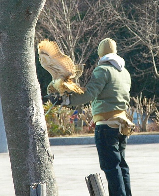 この写真は、先日1月9日に「あいち健康の森」に行った時のものです。この愛知県では、鳥を腕に乗せている人って非常に珍しいです。だから、背後からこっそり写真を撮らせていただきました。そして、鳥さんはというと・・・ふくろうさんでしょうか?立派な体格でした。