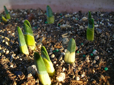 これは、我が家の巨大花壇・・・いや、プランターに・・・植えてある水仙の芽です。もう咲いているところも多いかと思いますが、うちの水仙は、半野生状態になっていますので、まだこの程度です。ちなみに、チューリップも他の場所に植えてあるんですが似たような感じです・・・orzこれでも、きっと春になると咲くんでしょうね。早く暖かくなって欲しいです。