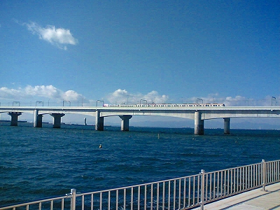 昨日は、家族で子供たちの服を買いに出かけたんです。そして、お昼は、ハンバーガーを買って、常滑(中部国際空港の近く)港に行って食べたんです。んで、撮ったのがこの写真・・・ただし、カメラを持って行ってないので、携帯で撮りました。まずは、空港への橋を渡る電車を・・・そして、ここから、三重県の鳥羽へ渡るフェリーを・・・
