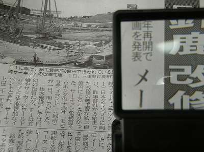 新聞です。3月2日の新聞ですが、記事の内容についてとやかく言わないこと!右側は凸レンズの虫眼鏡越しで、左側はそのまま撮ったんです。なかなかな技でしょ、新聞までの距離は同じなのでちゃんと写るんですよ。ただ、虫眼鏡のレンズのひずみの分ボケちゃうんですけどね。最近、暗いところで小さな文字を見ようとすると見えなくて・・・^^;おまけに、30cmくらいの距離では近すぎる感じで、ちょっと離さないと・・・^^;完全に老視(老眼)になり始めてます。まだ、44歳ですが、気分はまだ30代・・・f^^;ちょっとは、現実を受け入れるべきかな・・・そういえば、最近耳鳴りも・・・^^;耳も老化の一途を辿ってるかも・・・そのうち、補聴器のお世話になるのかなぁ~・・・camera ・・・ Nikon COOLPIX E4800date ・・・ 2008.33/8 アメブロ版の記事 ・・・ 水鳥です