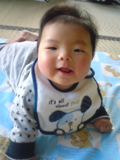 秀彦の寝返りやっとできました今まではちょっと押してあげないとだめだったのにできないのか、しないのか微妙でしたが、今日は自分でおもちゃを取ろうとして上手にできました秀彦はお座りが大好きで、首が据わってからはソファーに座らせてました5ヶ月で手を突いて座り始めて、5ヵ月半くらいでおもちゃを持って遊び始めましたうつ伏せが嫌いなので、寝返りをしなかったのかな毎日が発見の連続で、ワクワク・ドキドキですが、秀彦の成長振りに驚きです一日が早くて・・・・明日はの予報ですが、本町まで行って五月人形を買ってもらいます初節句なので、楽しみです
