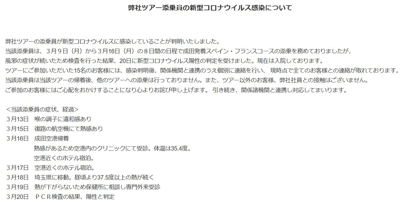 24日の国内感染者、新たに71人確認…東京は全国最多に - 記事詳細|Infoseekニュース新型コロナウイルスの感染拡大で、国内では24日、1日当たりの感染者としては最多となる計71人が新たに確認された。このうち東京都内の居住者は18人で、東京の感染者数は北海道を抜いて全国最多の171人となった。東京都では24日、すでに感染が判明し、台東区の永寿総合病院に入院していた70歳代の男性が死亡し…【全文を読む】『JTB... 企業責任を感じない会社なの?』TVで「外務省の渡航情報に沿って判断しています」と言ってましたが (-_-企業判断レベルが他人事・人任せなJTBだと感じました。まぁ 日本人参加者が15名も居たと言うのも異常だと思うのですが...海外では外出禁止や国境封鎖が続いてる中の強行突破。そんなJTB判断はCOVID-19感染者を発生させて当たり前の結果となってます。オリンピック延期が決定される中での愚行営業だったと感じます。企業も一般人も馬鹿な日本人が増えてると言う事なのでしょうか?今の状態では来年のオリンピック開催も危ぶまれる日本の状況なのでは?もう少し真剣な対応が必要かと思います。