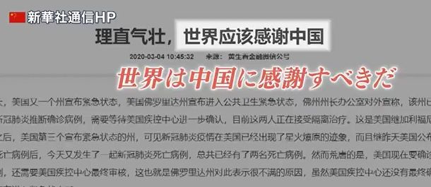 新型肺炎は米国が起源!? 「世界は私たちに感謝すべき」と“逆ギレ”する中国の思惑 - 記事詳細|Infoseekニュース「道理を正して、世界が中国に感謝すべきだ」2020年3月4日、新華社にこんなタイトルの記事が掲載された(http://www.xinhuanet.com/2020-03/04/c_1125660473.htm)。その一節を訳出してみよう。新型肺炎対策は“中国の偉業”?「中国は世界に謝罪するべきだとい…【全文を読む】『さすがに笑えました... 』「世界が中国に感謝すべきだ」第一発生国で感染隠蔽した国が言える言葉か?と言う思いです。喉元過ぎれば熱さ忘れる... とはよく言ったものですね。中国には15年以上も赴任してたので【国民性】は十分わかってますが、一般人と同じ言動を国がやってしまうのですから今回は笑えました。「各国が感染対策をとれたのは中国が犠牲になったおかげ」... だそうです。 いやいや。中国がCOVID-19感染を隠蔽しWHOにも報告しなかったから世界中に感染拡大したんでしょ?せっかく経済大国に成れたのに、これじゃぁ何処からも軽蔑されてしまいます。そして中国国内へ向けて「COVID-19の収束に向け好転してる」と言ってしまい、中国一般市民は一気に買い物や観光に出掛け何処も人のごった返しが始まり (-_-;20年前から現在まで【国民性】は何も変わっちゃいないと。 もう一度 煮え湯を飲めば忘れた事を思い出す事でしょう。