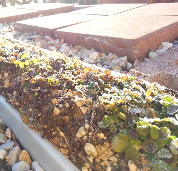 昨年10月に種を撒いた蓮華(レンゲ)も霜でカチカチに。