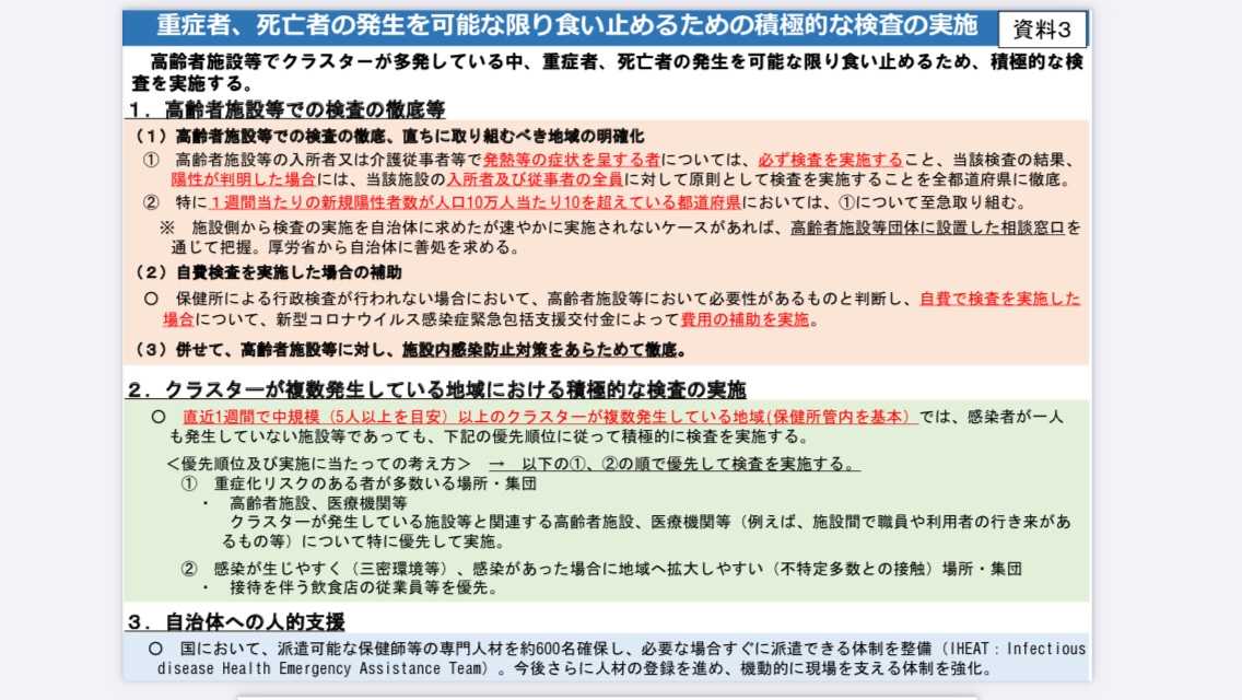 さらに、重症者の発生を可能な限り食い止め、国民の命を守るために、医療施設や介護施設等において陽性者が確認された場合には、入所者・従事者全員に、直ちに国の費用負担で検査を実施します。