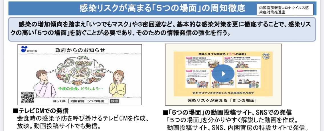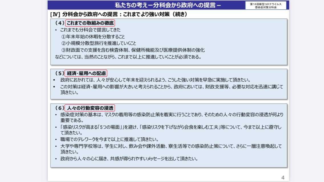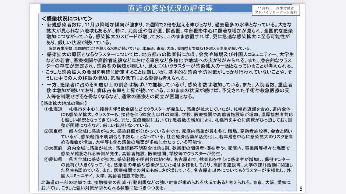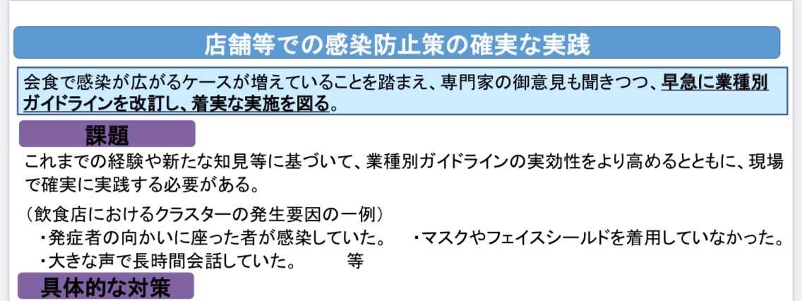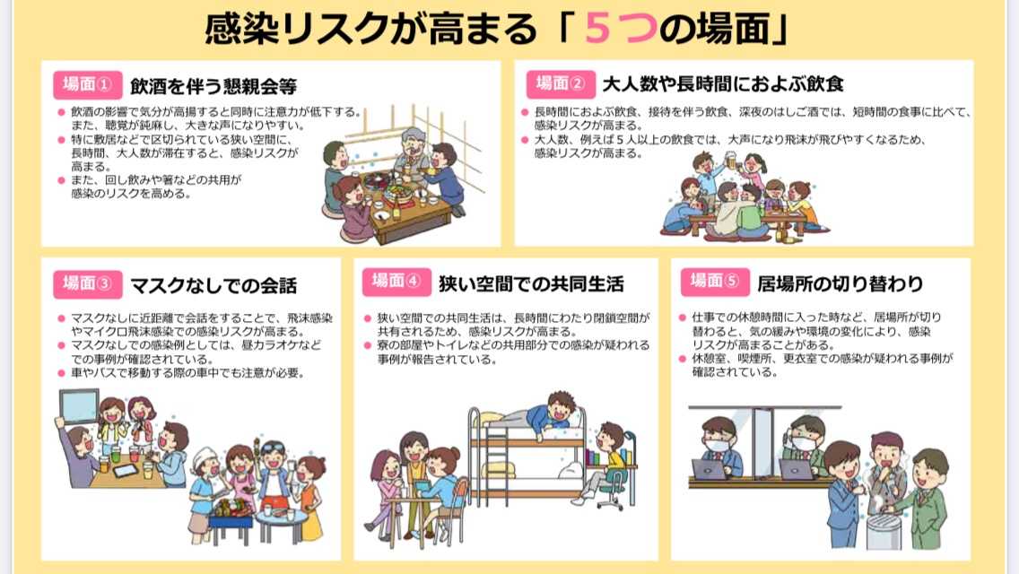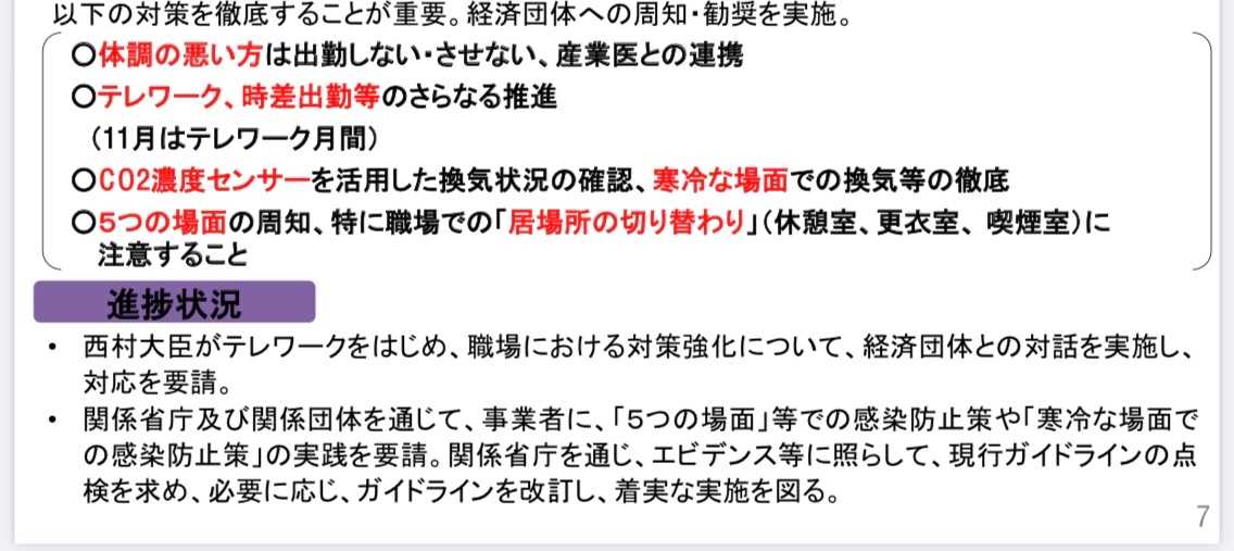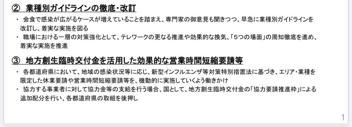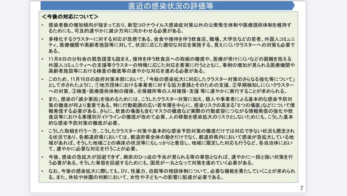 感染拡大が続く中、社会経済活動に対し、更に一段の強い対策を講じる事態を回避するためにも、国民の皆さんの御協力が不可欠であります。改めて、科学的にも効果が立証されてます、会食時を含めたマスクの着用、手洗い、3密の回避、基本的な感染対策の徹底をよろしくお願い申し上げます。」