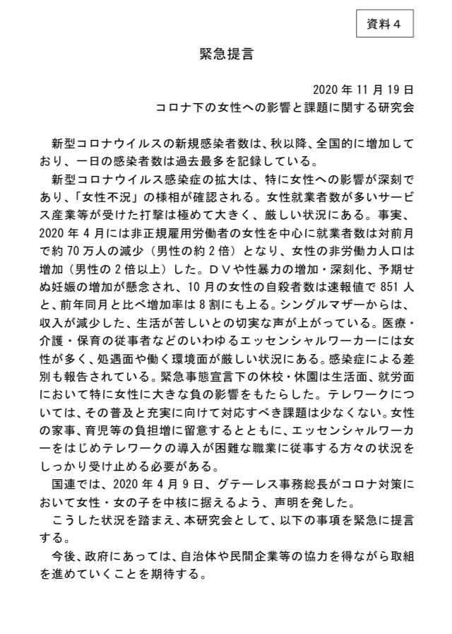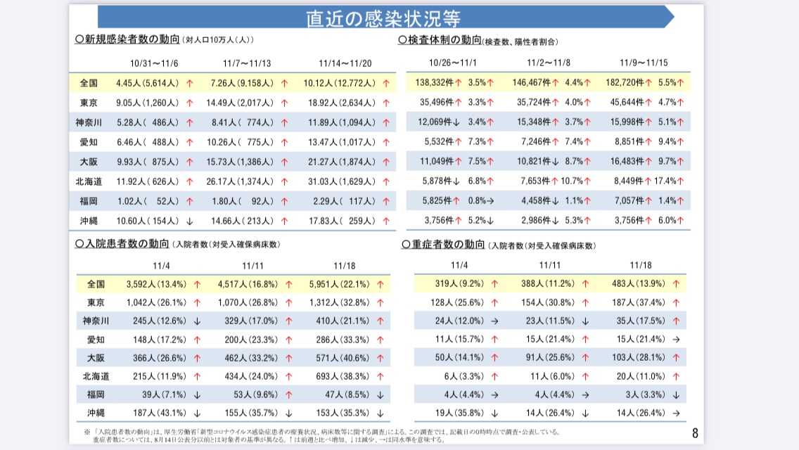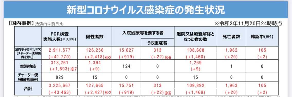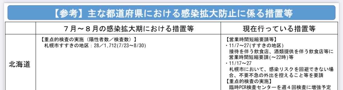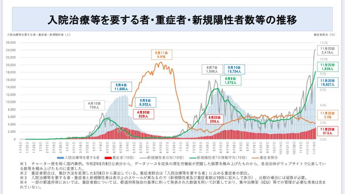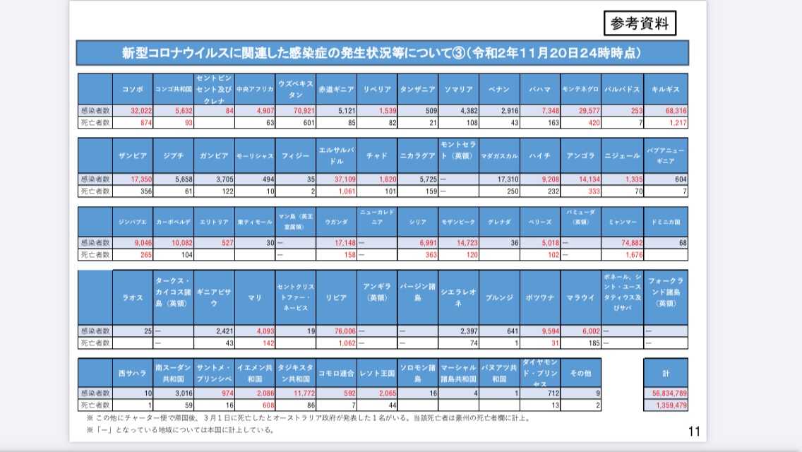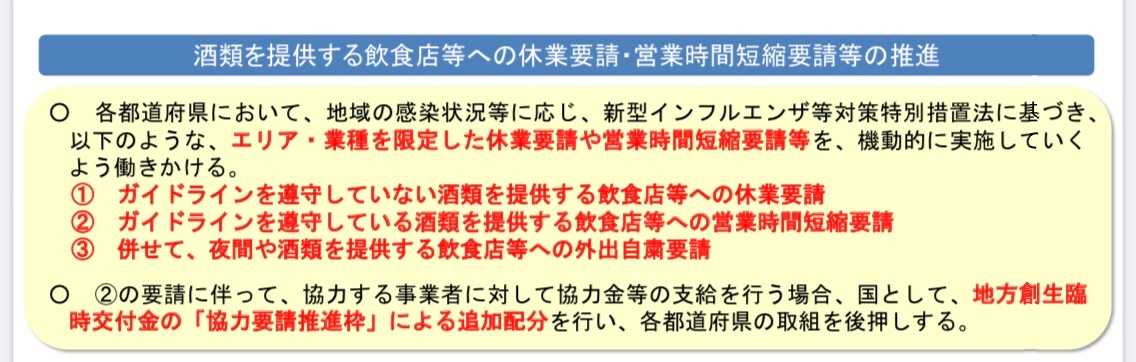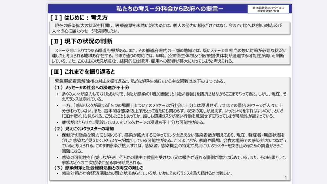 感染拡大が続く中、社会経済活動に対し、更に一段の強い対策を講じる事態を回避するためにも、国民の皆さんの御協力が不可欠であります。改めて、科学的にも効果が立証されてます、会食時を含めたマスクの着用、手洗い、3密の回避、基本的な感染対策の徹底をよろしくお願い申し上げます。」