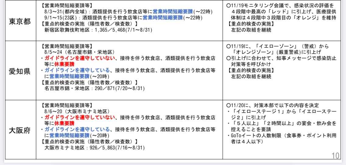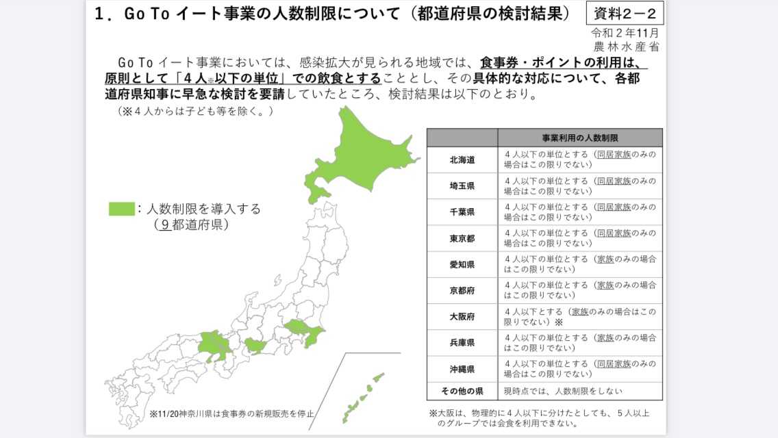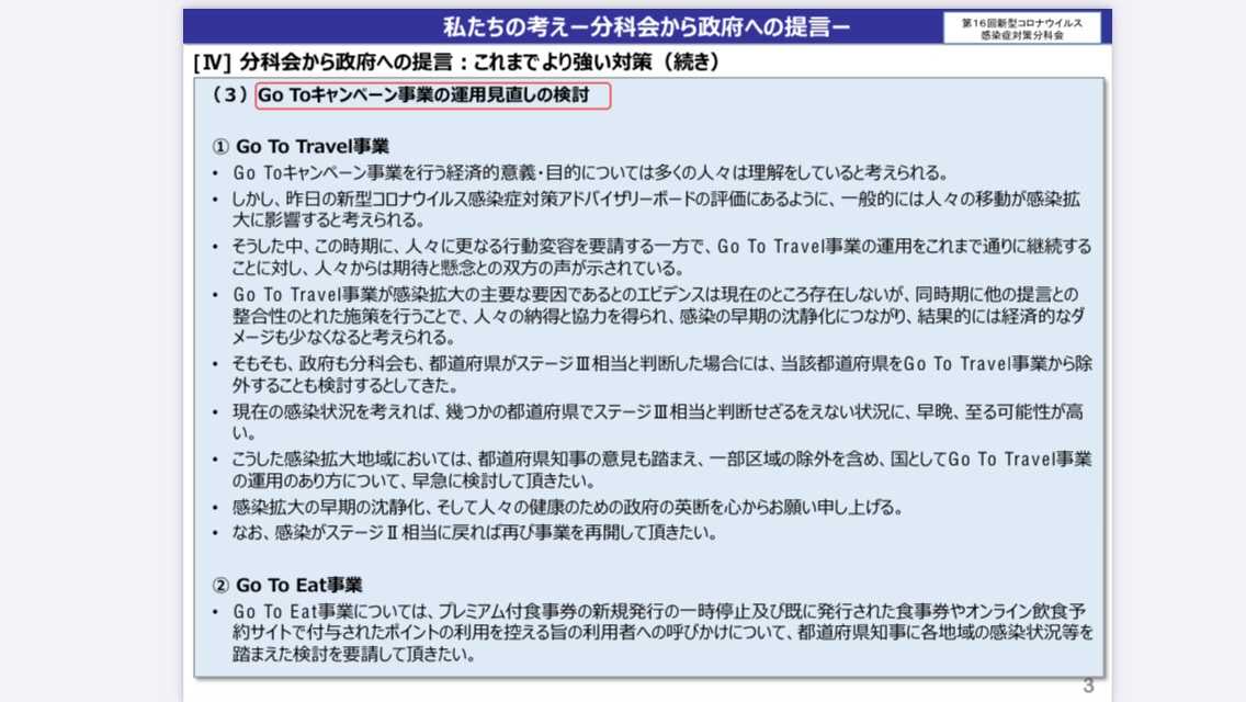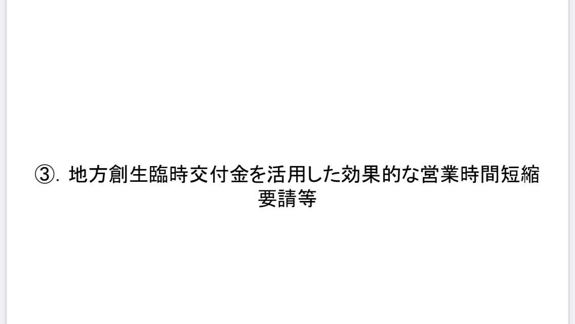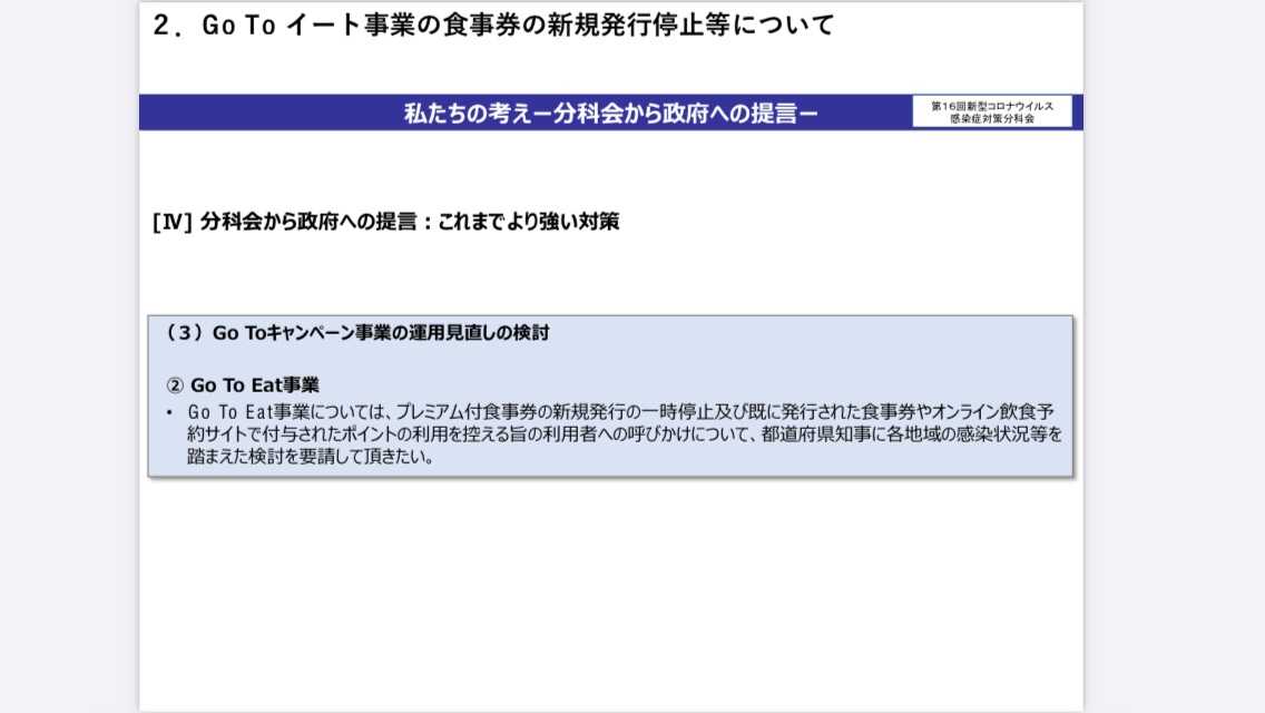 具体的には、GoToトラベル事業については、感染拡大地域を目的地とする旅行の新規予約を一時停止するなどの措置を導入します。GoToイート事業については、食事券の新規発行の一時停止やポイント利用を控えることについて検討を要請します。また、各都道府県が、飲食店に対し、営業短縮などを要請する際、地方創生臨時交付金の500億円の追加配分により支援する体制をとっております。