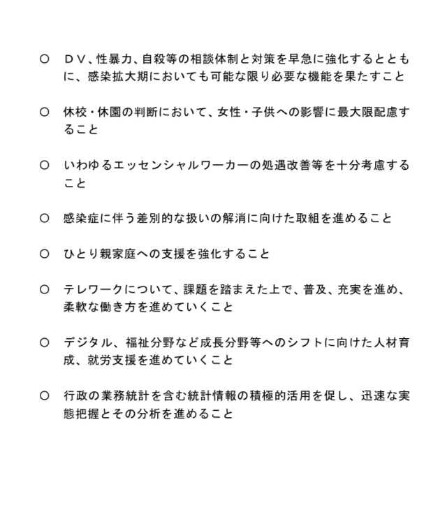 各大臣におかれては、国民の命と暮らしを守るために、自治体と緊密に連携しながら、これらの対策に全力で当たっていただきたいと思います。