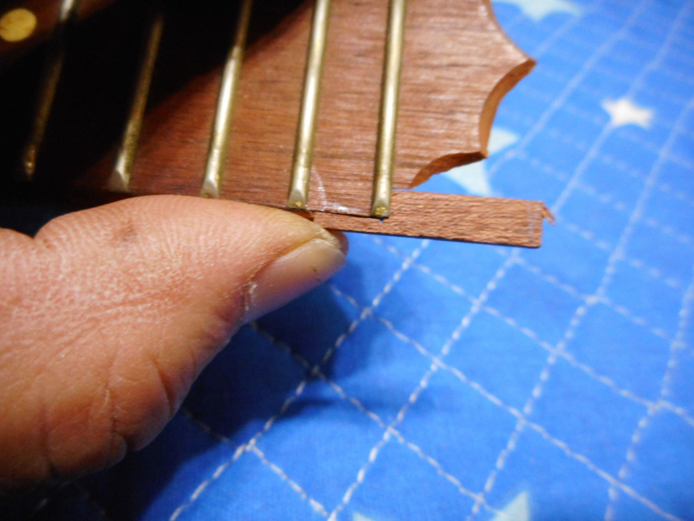 ●欠損箇所の修復です。予め削り出しておいたマホガニー材を欠損箇所に接着します