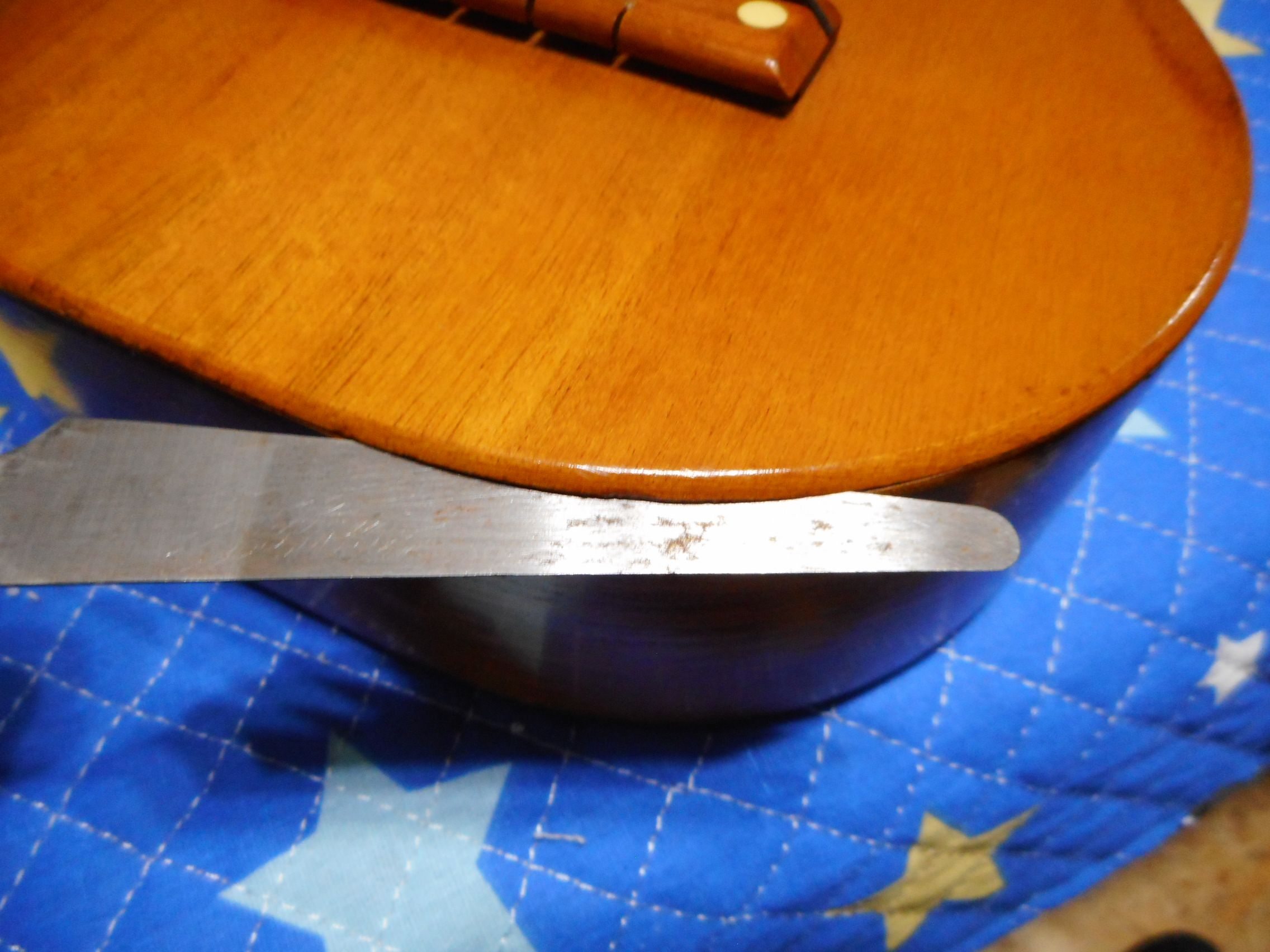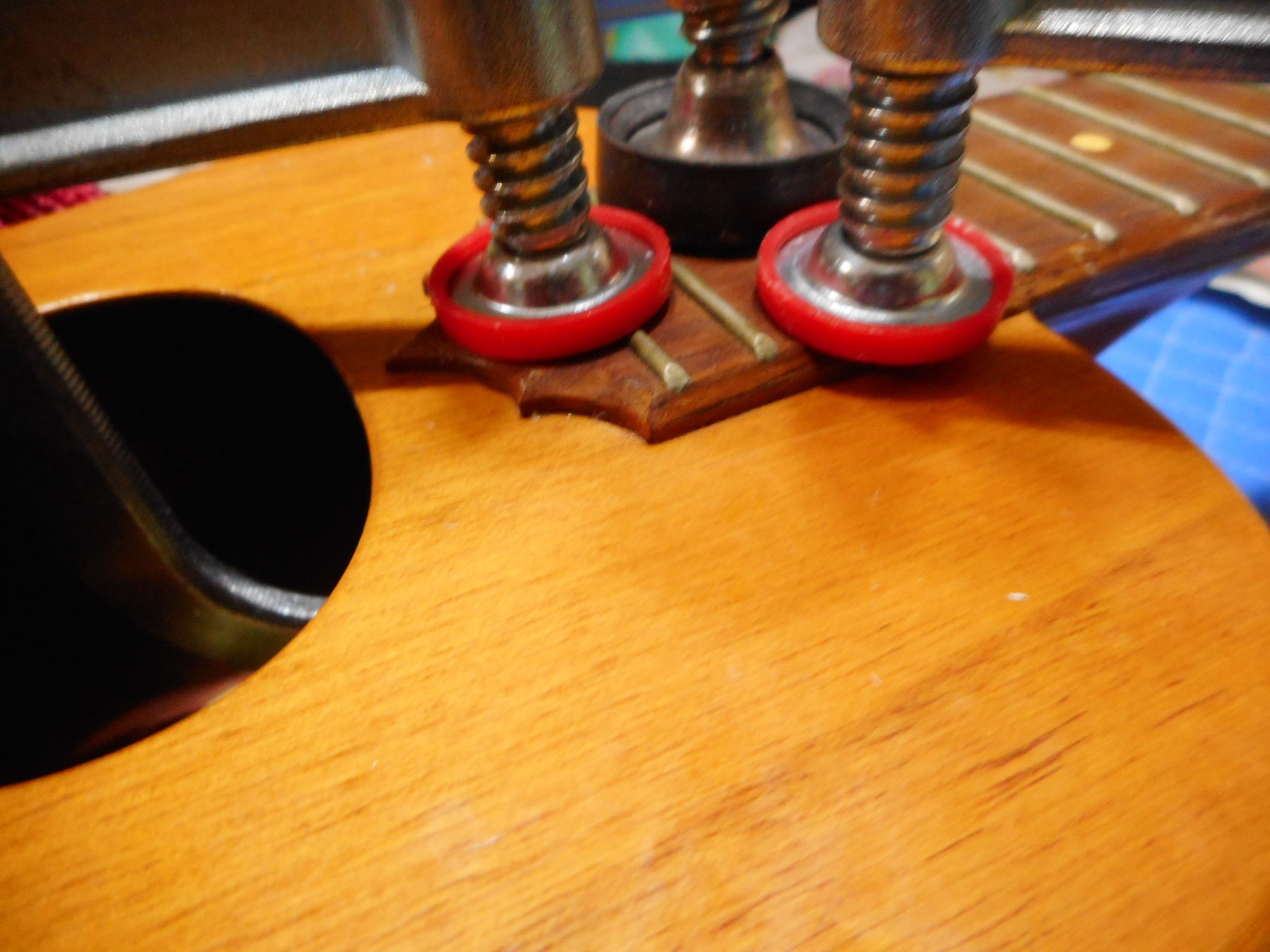 ●セットして軽く押さえますと1弦側は殆どピッタリ密着しますが、4弦側は欠損して