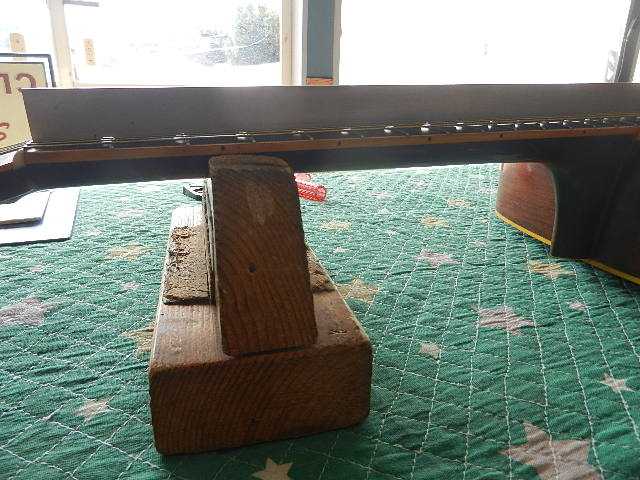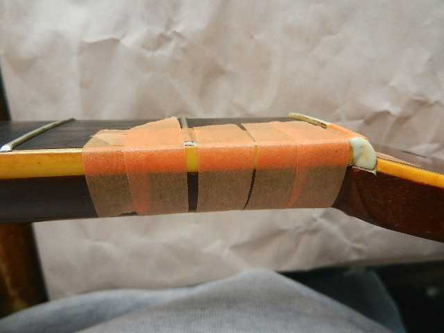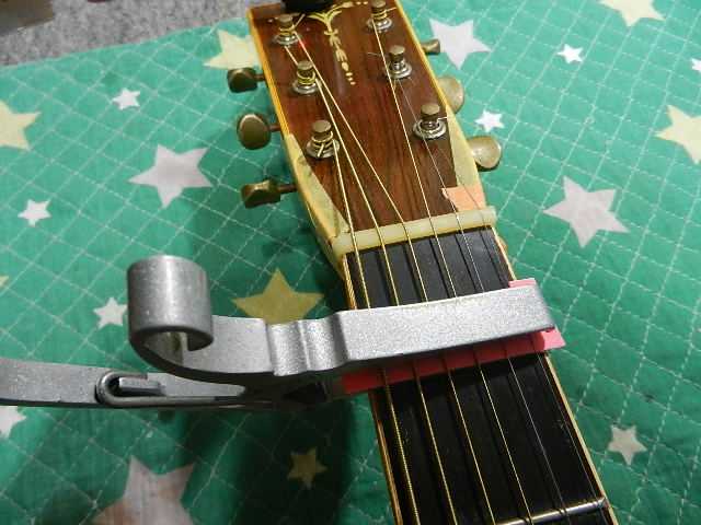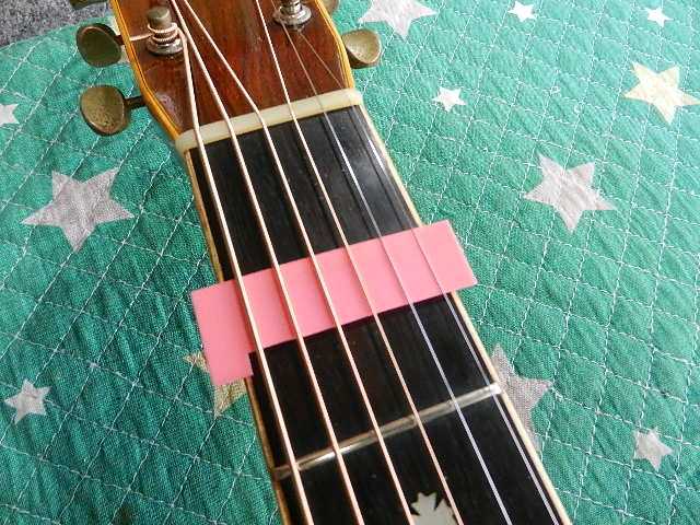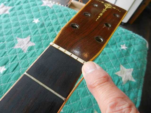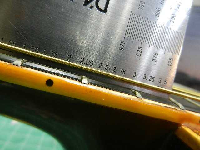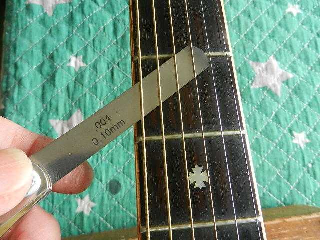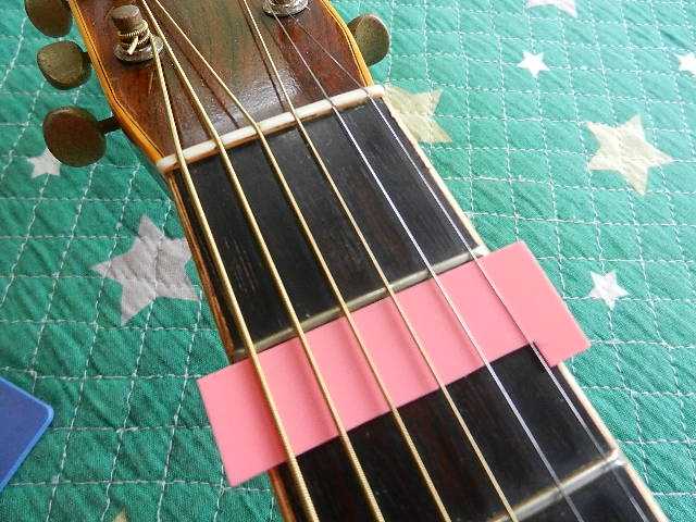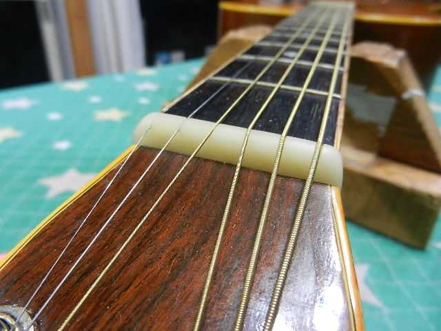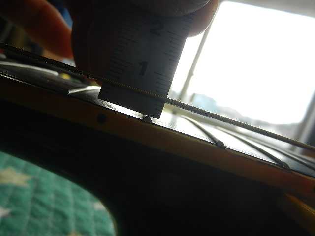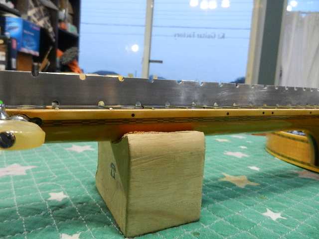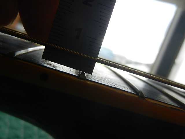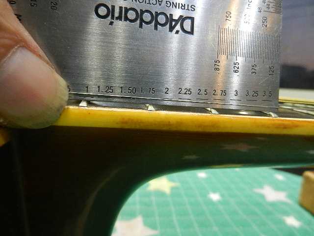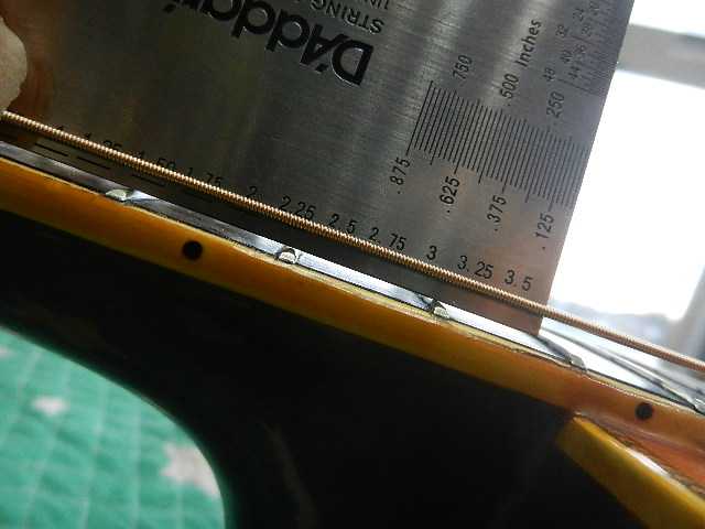 ●高さ調整したサドルで弦を張り戻しますと、予想通り1フレットのクリアランスが
