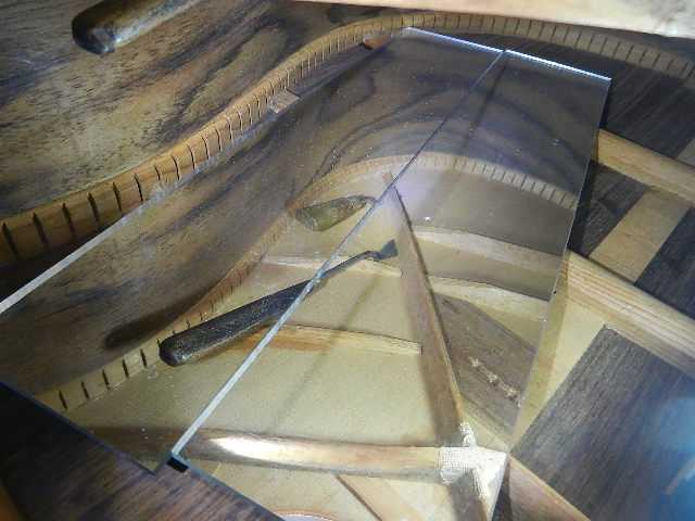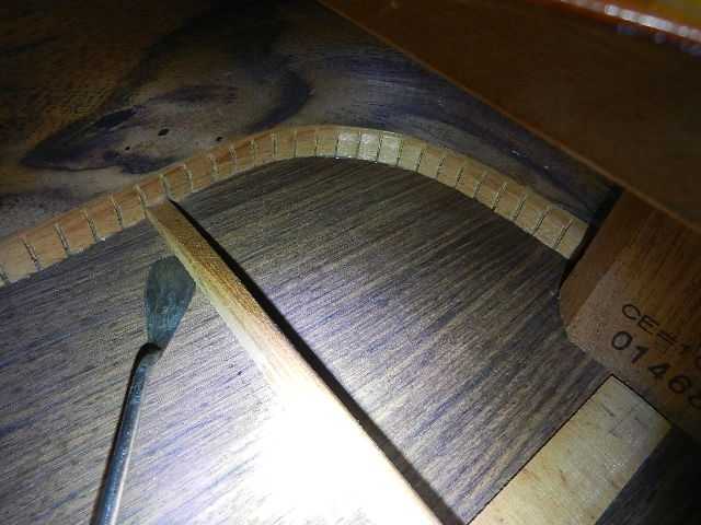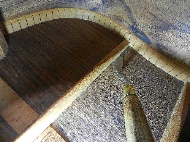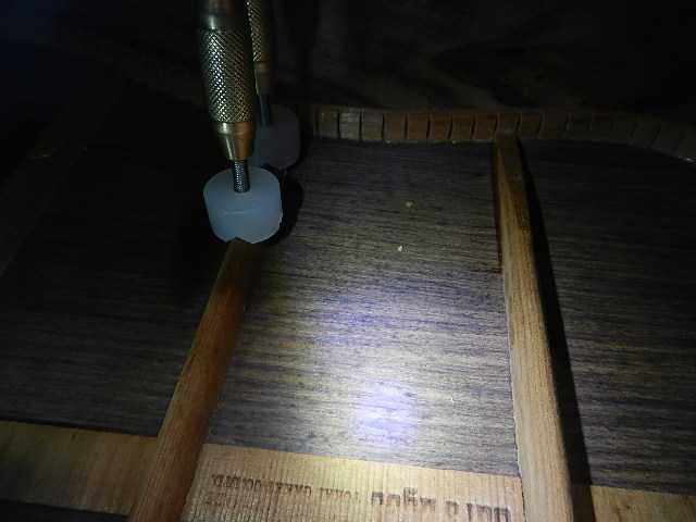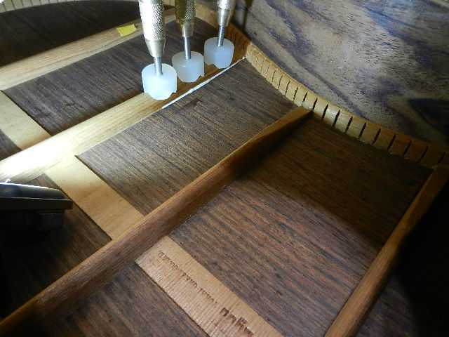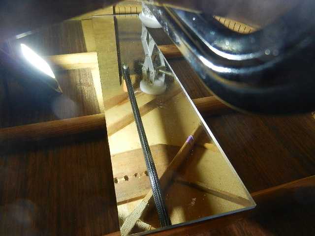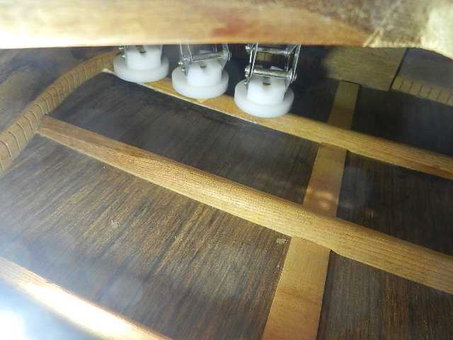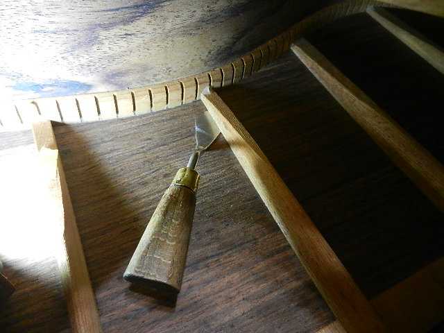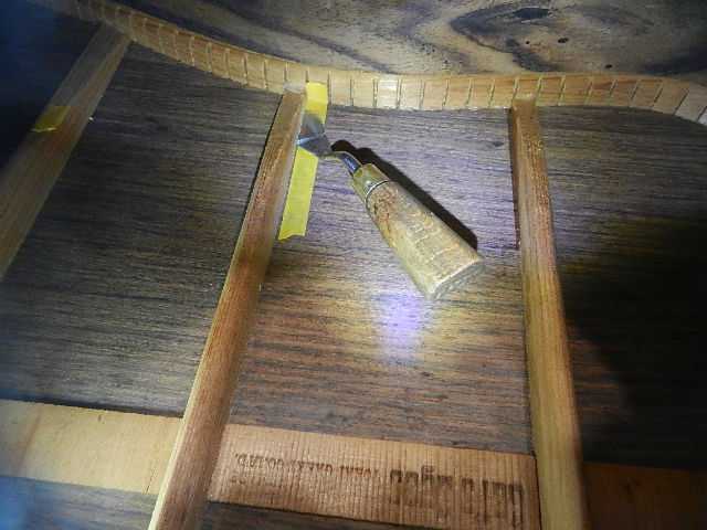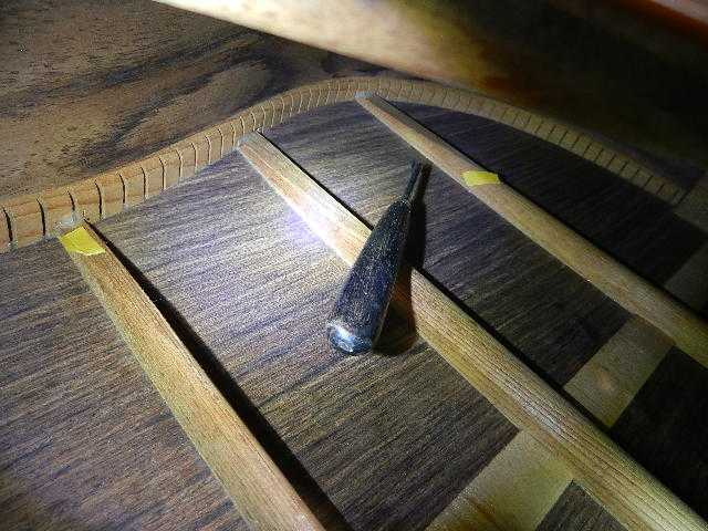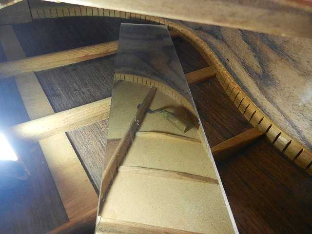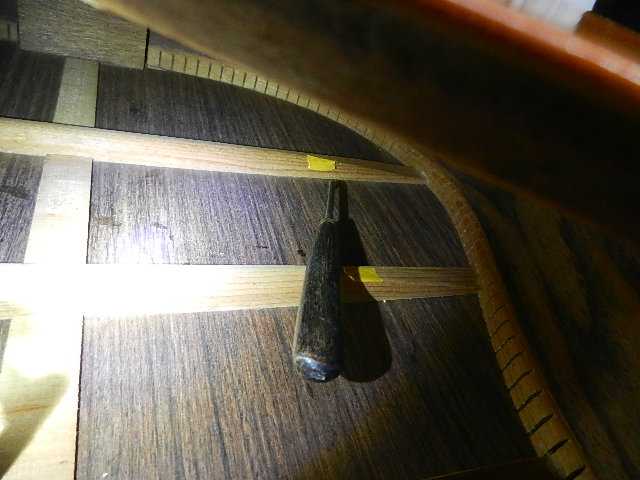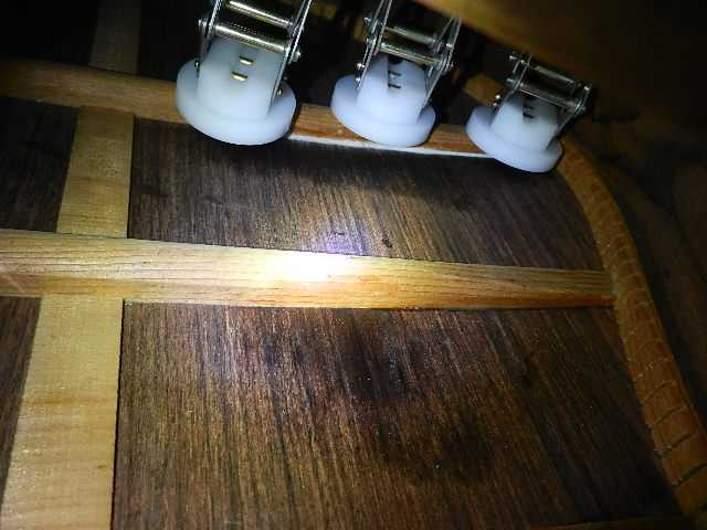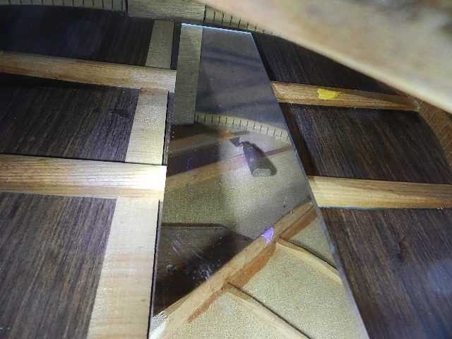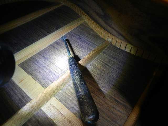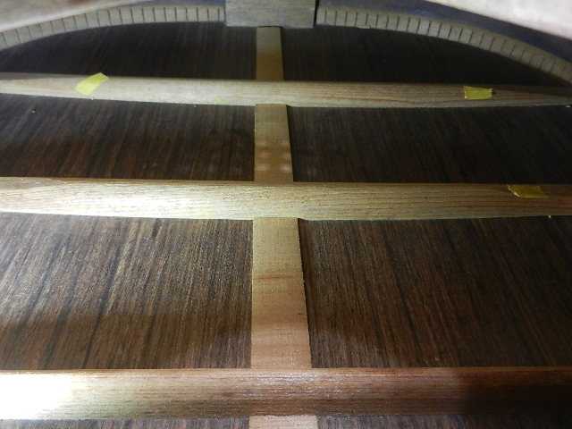 ◆バック側ブレーシングの接着固定が済ましたのでトップ側を確認します