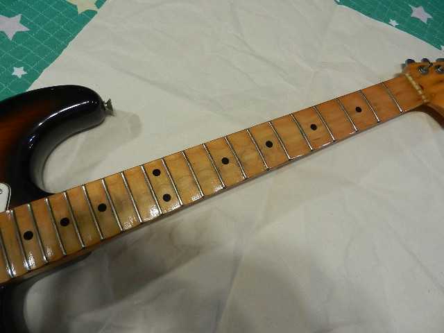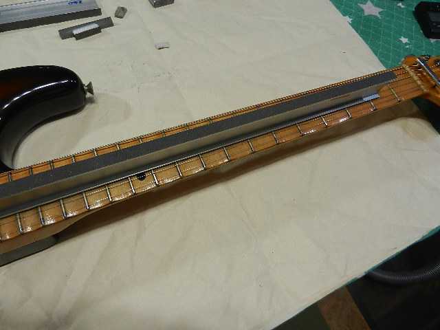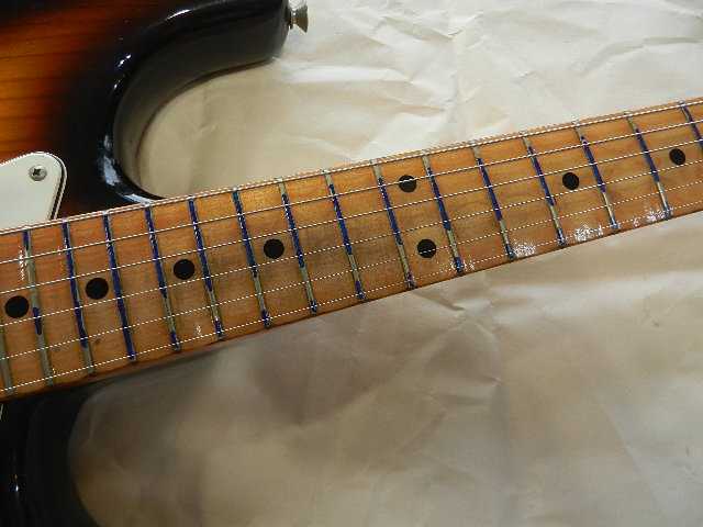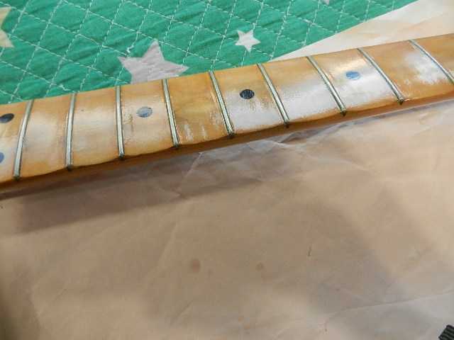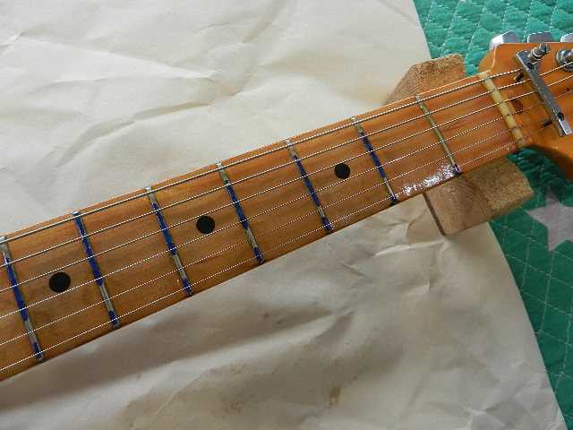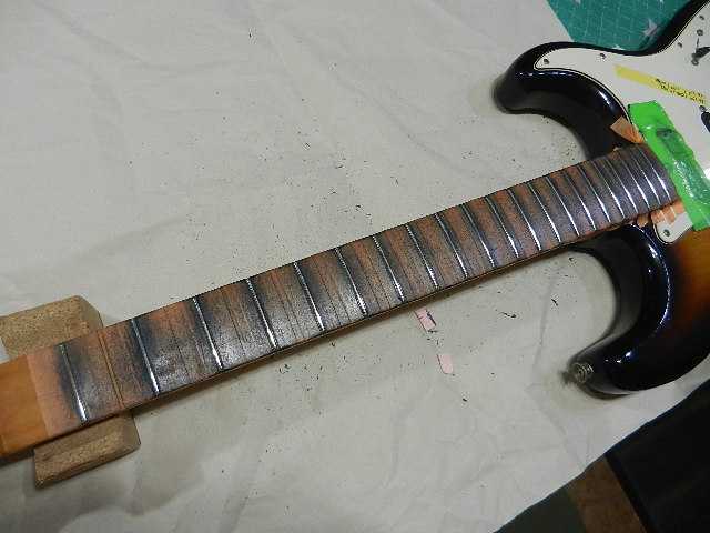 スキャロップ加工後にフレットに付いクリアラッカーも取り除いて有ります