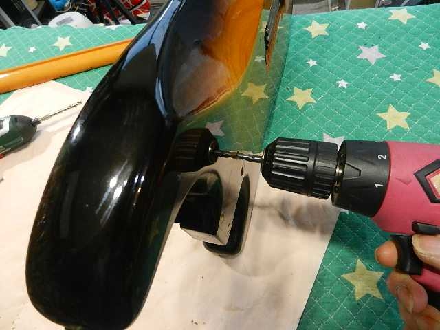 ドリルで穴を広げてからネックを取付て強度を確認します