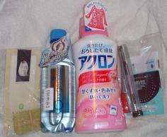 本日の出張ラボ、今までの中で最も収穫がありました。在庫処分でしょうか?左から女優の石鹸(有限会社Nobke-Japan) 30g[実売価格は140gで3675円]、オキシゲナイザー(株式会社アクシス) 189円、アクロン(ライオン株式会社) 345円、メイベリンWSリップデュウ 840円、メイベリンノンストップアイライナー 840円、メイベリンピュアミネラルリキッド (日本ロレアル株式会社)