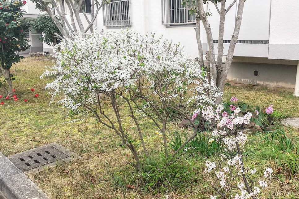 ​ ​​​こんな様子です。一株だけ植わっている 雪柳 の方が元気そうに見えますが、 山桜桃梅 というのは、まあ、こういう姿の木のようですね。この 団地 に暮らし始めてから 40年近く 、ずーっと、ここにあると思うんですけど変わりません(笑)​​​​