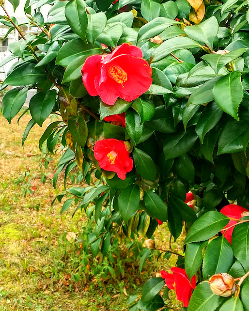 で、 写真の向こうにある、 そろそろ終わりそうな、 ​椿​ です。沢山咲く花ですが、一つ一つ、立派に咲いています。