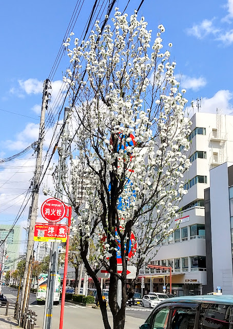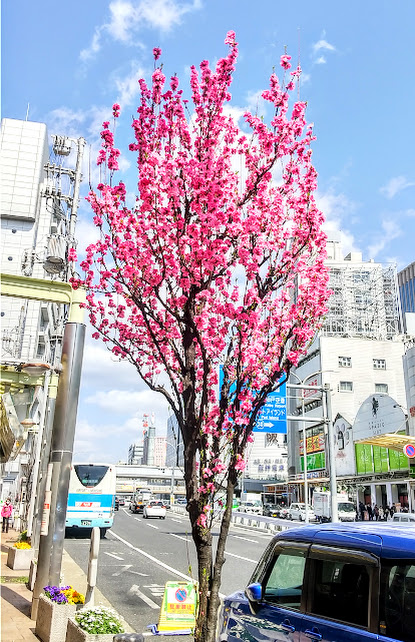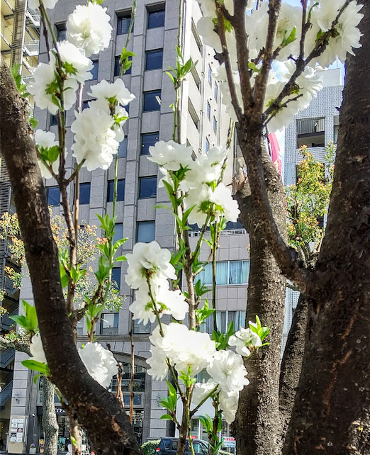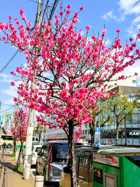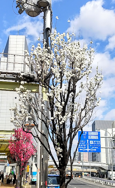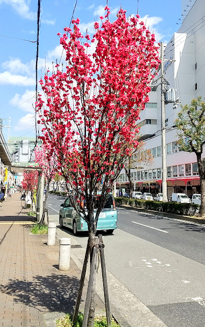 「咲いてました!」 世間では、もちろん、もう 桜 なんですけど、ここでは、多分、 箒桃(ホウキモモ) だと思うのですが、 元町駅 から 三宮駅 まで、今が