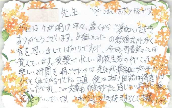 グッド・ウィル・ハンティングの旅の 旅立ちに乾杯! です。 司書室のチキンラーメンの味が忘れられないことを ボツ・カード で伝えてくれた Oくん は、高校時代から、すでにして、 グッド・ウイル・ガイ だと思っていましたが、この日初めて出会った カナちゃん も素敵でした。まあ、 ボツ・カード を捨てずにテーブルに置いていてくれたことが、とにかく サイコー! でした(笑)。
