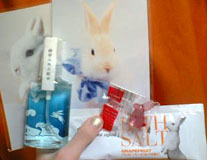 これが今回キリプレに追加したものです。ホントにささやかなものばかりです。この他は既に紹介したハンカチ、うさぎシールセットです。点数は多いが…。真中のはお部屋のフレッシュナーです。ようは消臭剤。「波うさぎの版画」(やすらぎの香り)緑茶エキス配合。マリンベースの香りにラベンダーをブレンドしました。約250回使用可能。ちなみに私のお気に入りのラベンダーグッズは歯磨き粉です。とってもおいしいです。長野のどこかの山で食べたラベンダーソフトの味は忘れられません。うさぎのバスビーズはパッションフルーツの香りだそうです。でもうさぎってパッションフルーツ食べるのか??お風呂で使えば跡形も無く溶けます。それが悲しい方は飾ってニンマリして下さい。こんな感じですが、まだもう少し何かみつけたら追加します。